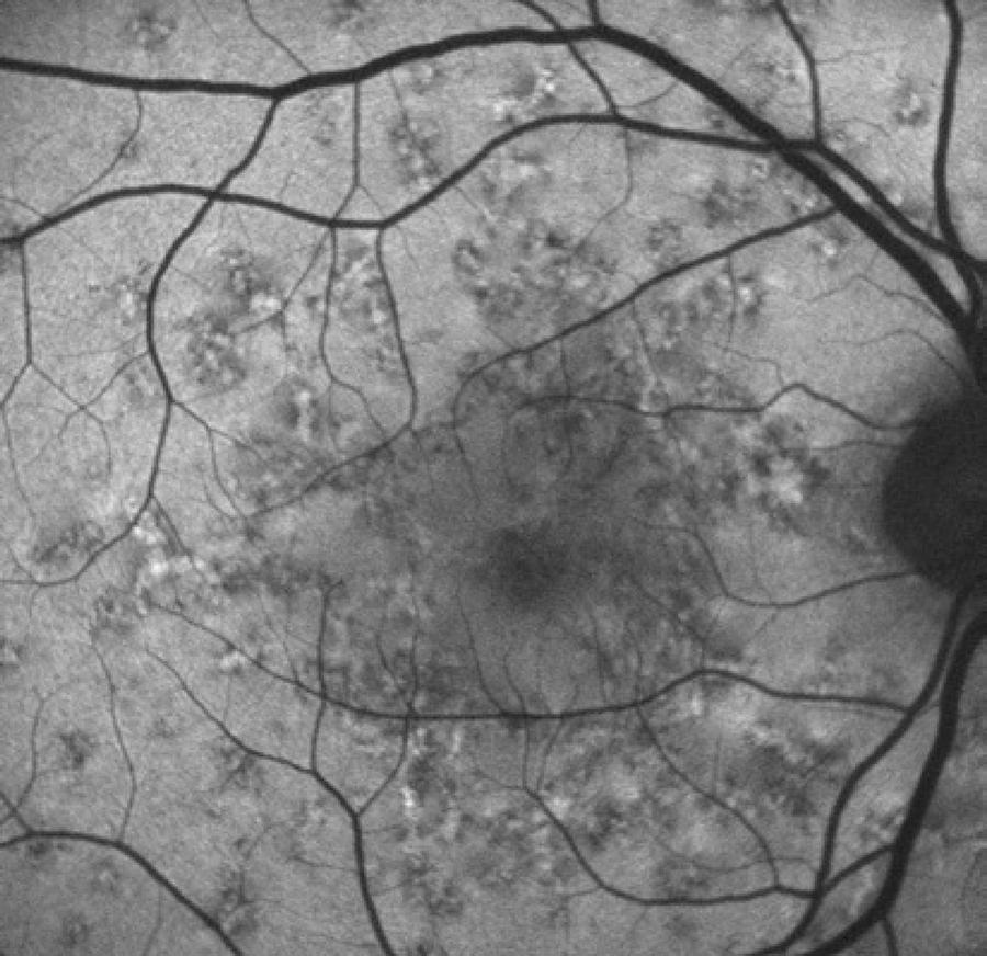Figure 2 Fundus autofluorescence showing high levels of autofluorescence in the center of the biomicroscopically visible flecks and surrounding halos with decreased autofluorescence signal.