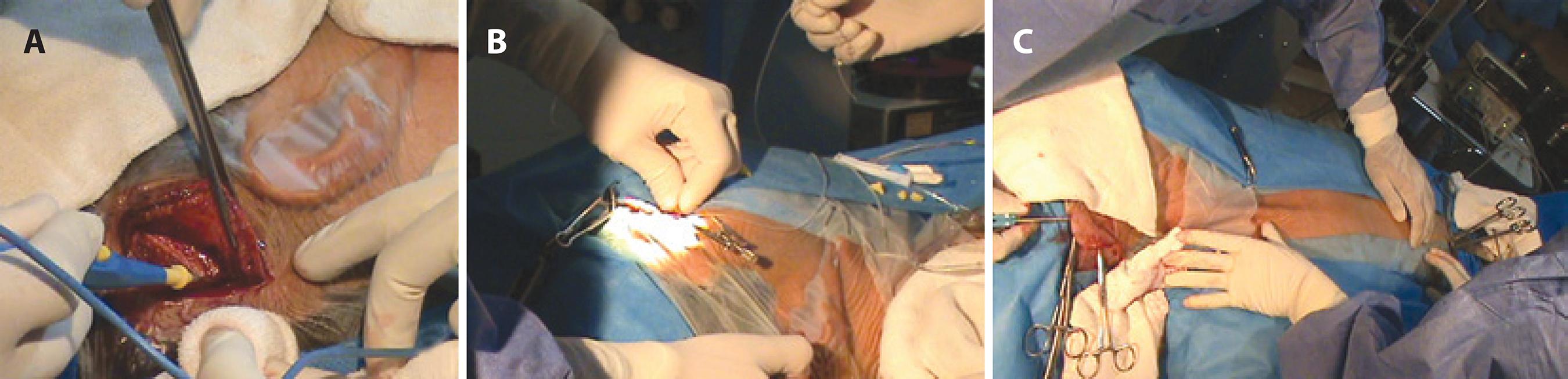 The surgical procedure begins with the formation of a fornix-based conjunctival flap. The conjunctiva is lifted and its rear face is incised, making an opening of sufficient size to allow a surgical guidewire to pass with a silicone tube mounted on it. An incision is made in the retroauricular region of the scalp (Figure 1A), and the ocular catheter mounted on the surgical guidewire is passed from the opening of the rear face of the conjunctiva to the scalp incision (Figure 1B). A tunneler is passed from the scalp incision to the periumbilical region (Figure 1C), and an opening is made in the skin and the peritoneum in this region. The hydrocephalus valve is positioned and the ocular and peritoneal catheters are assembled with the hydrocephalus valve (Figure 2A). Next, puncture of the anterior chamber of the eye is performed, and the ocular catheter is inserted. A chamber maintainer is placed (Figure 2B) and connected to a bottle of balanced saline solution to test the permeability of the system (Figure 2C). The peritoneal catheter is then introduced. All surgical wounds are closed.