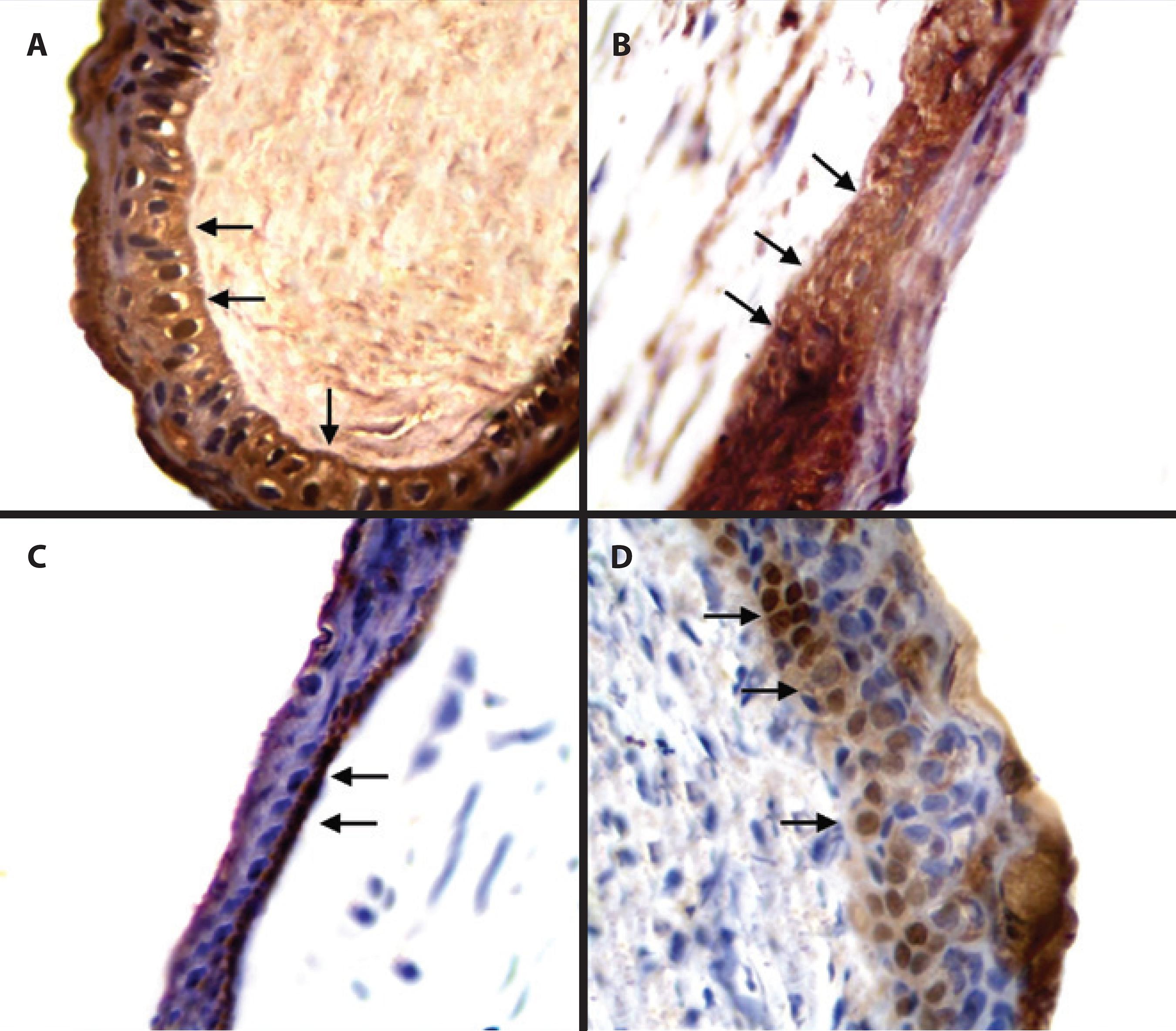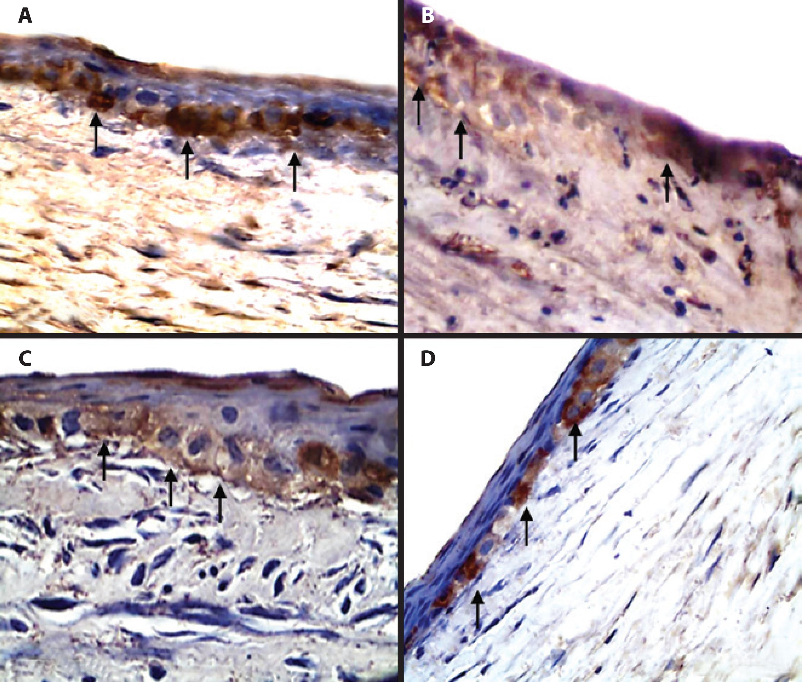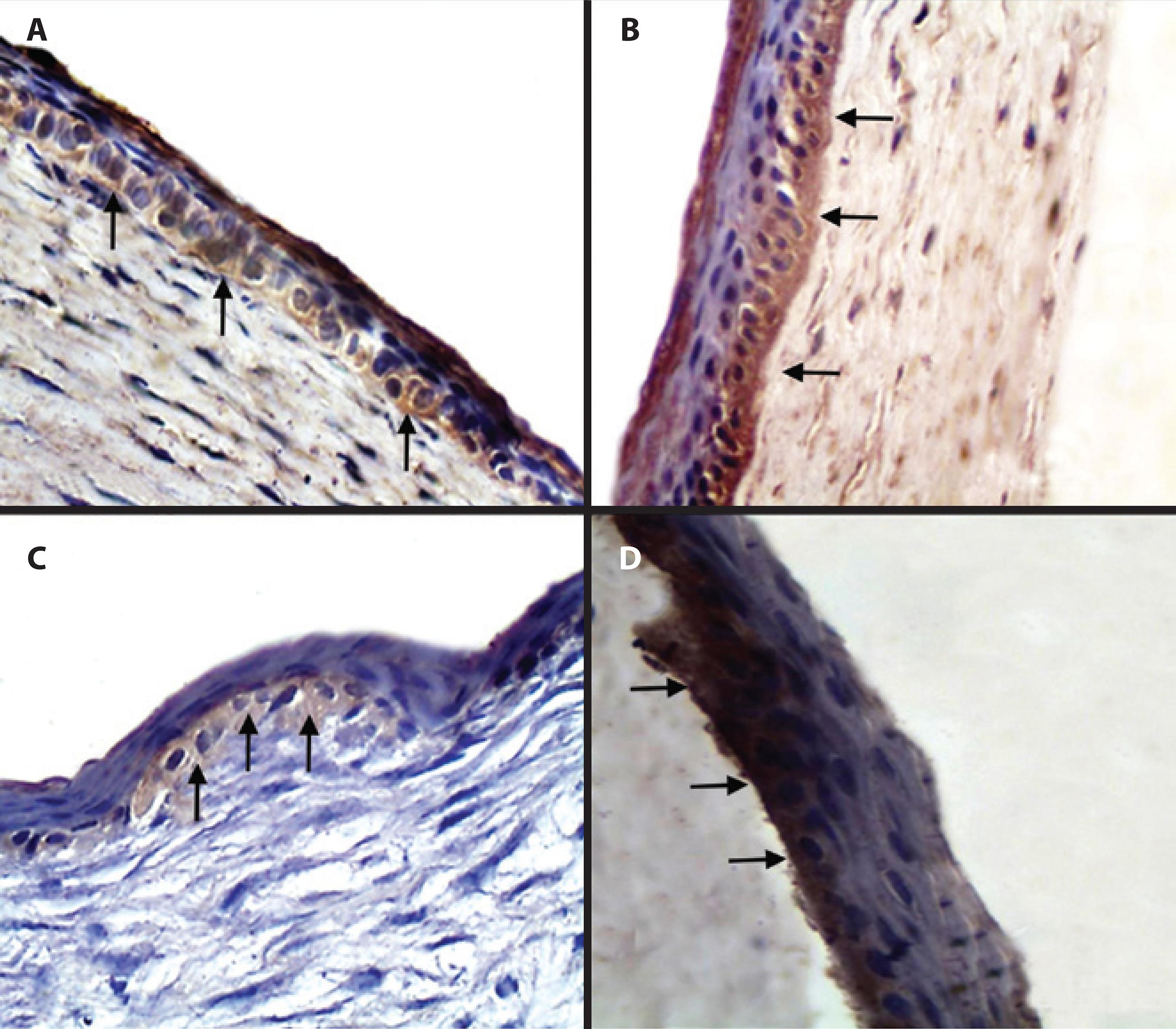 Regarding OGF, cytoplasmic localization in the epithelial supra-basal and basal cells was observed. No differences in OGF expression were observed between the periods (IHC scores of 1 and 2 for all) or between the groups (p>0.05) (Figure 3).