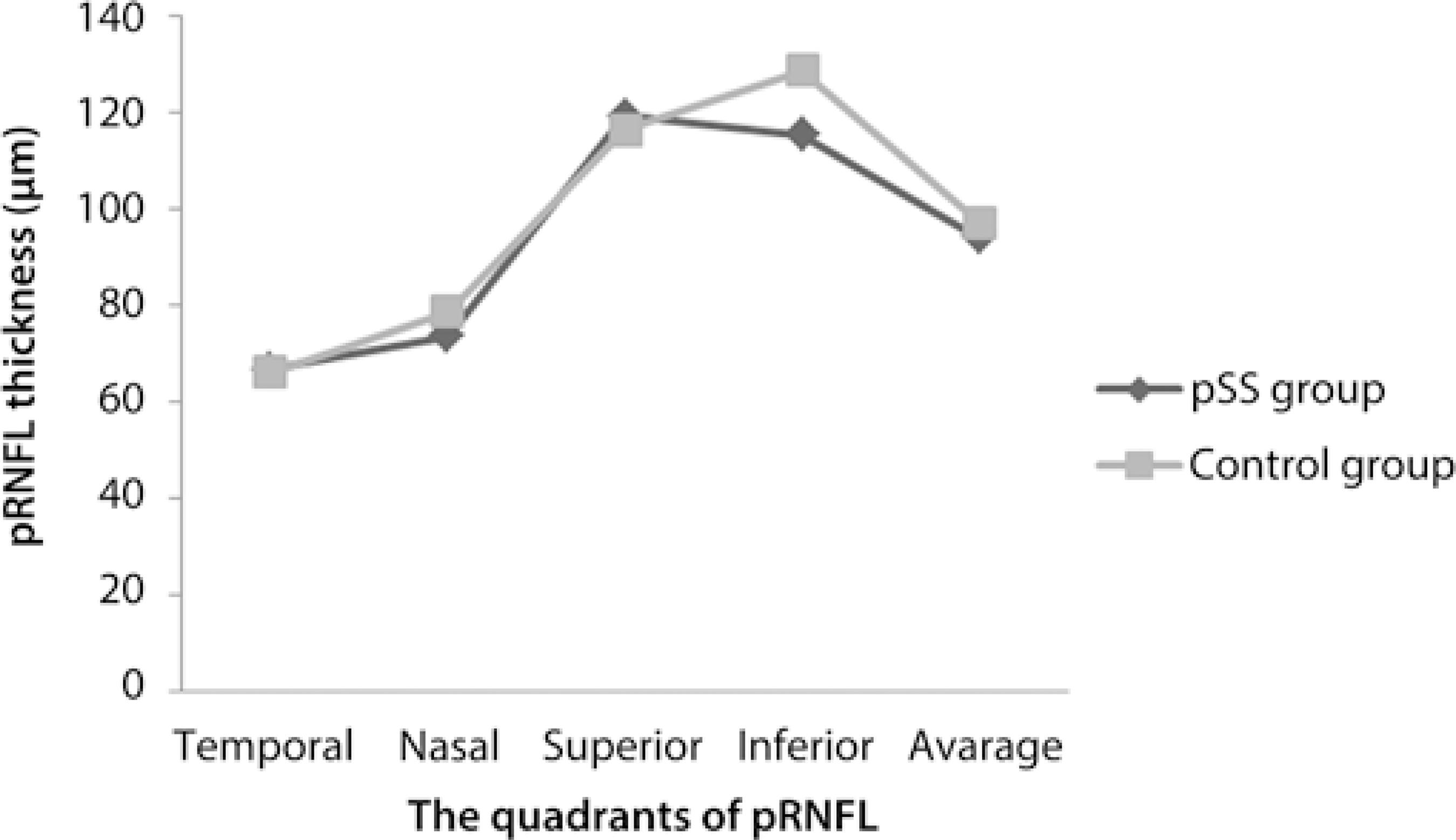 Fourteen right eyes of 14 female pSS patients and 14 right eyes of 14 female healthy subjects were enrolled into this study. The participants were divided into 2 groups: the pSS group comprising the pSS patients and the control group comprising the healthy subjects. The mean duration of disease was 5.7 ± 5 (1-20) years in the pSS group. All pSS patients who participated in the current study were under treatment with hydroxychloroquine (HQ); the mean duration of HQ usage was 3.8 ± 2.8 (1-10) years. The mean logMAR value of the BCVA was 0 in both groups. The mean age of the pSS group and control group was statistically similar [51.3 ± 5.7 (45-64) years and 49.2 ± 5.9 (39-58) years, respectively] (p>0.05). There were no statistically significant differences between the 2 groups in terms of the spherical equivalent value [0.47 ± 0.79 (0.00-2.50) D and 0.46 ± 0.53 (0.00-1.50) D, respectively] (p>0.05). In the pSS group, 5 and 2 patients were positive for the anti-Ro antibody and anti-La antibody, respectively, whereas 4 patients were positive for both anti-Ro and anti-La antibodies; 3 patients were negative for both anti-Ro and anti-La antibodies. In the control group, all participants were negative for both anti-Ro and anti-La antibodies. All relevant clinical data for the pSS patients is presented in table 1.When we compared the thickness of pRNFL in all quadrants, only the inferior quadrant of pRNFL in the pSS group was statistically significantly thinner than that in the control group (p<0.05) (Figure 1). There were no statistically significant differences between the 2 groups in terms of the CS function at all spatial frequencies such as 1.5, 3.0, 6.0, 12, and 18 cpd (p>0.05) and in terms of the RMS values of coma-like, spherical-like, and total HOAs (p>0.05) (Figure 2 and Figure 3, respectively). The thickness of mGCIPL in the pSS group and control group was similar [85.7 ± 3.7 (80-92) µm and 85.8 ± 4.2 (81-92) µm, respectively] (p>0.05).