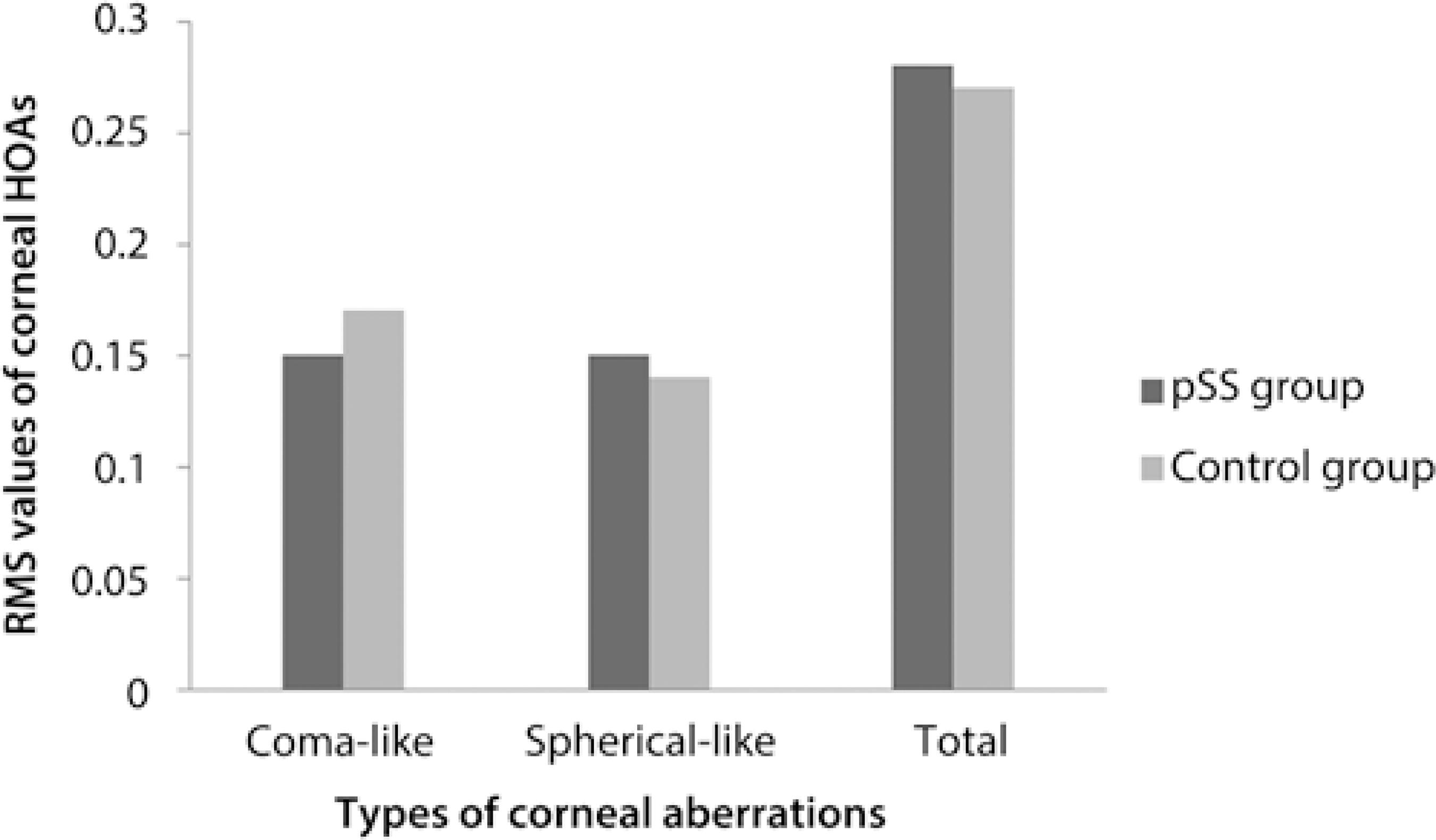 Zhang et al. reported a modest effect of instilling artificial tears on CS in pSS patients, primarily at medium spatial frequencies(28). In this current study, although none of the participants were using artificial tears, there were no significant differences between the pSS group and control group either in terms of CS tests measured at all spatial frequencies or in terms of total, coma-like, and spherical-like HOAs. These similar results may be attributed to the use of HQ in pSS patients, because the alleviating effect of HQ (reducing the levels of BAFF in the tear fluid of pSS patients) has been demonstrated in a previous study(29). In another study, the beneficial effect of HQ on xerostomia has also been demonstrated in pSS patients(30).