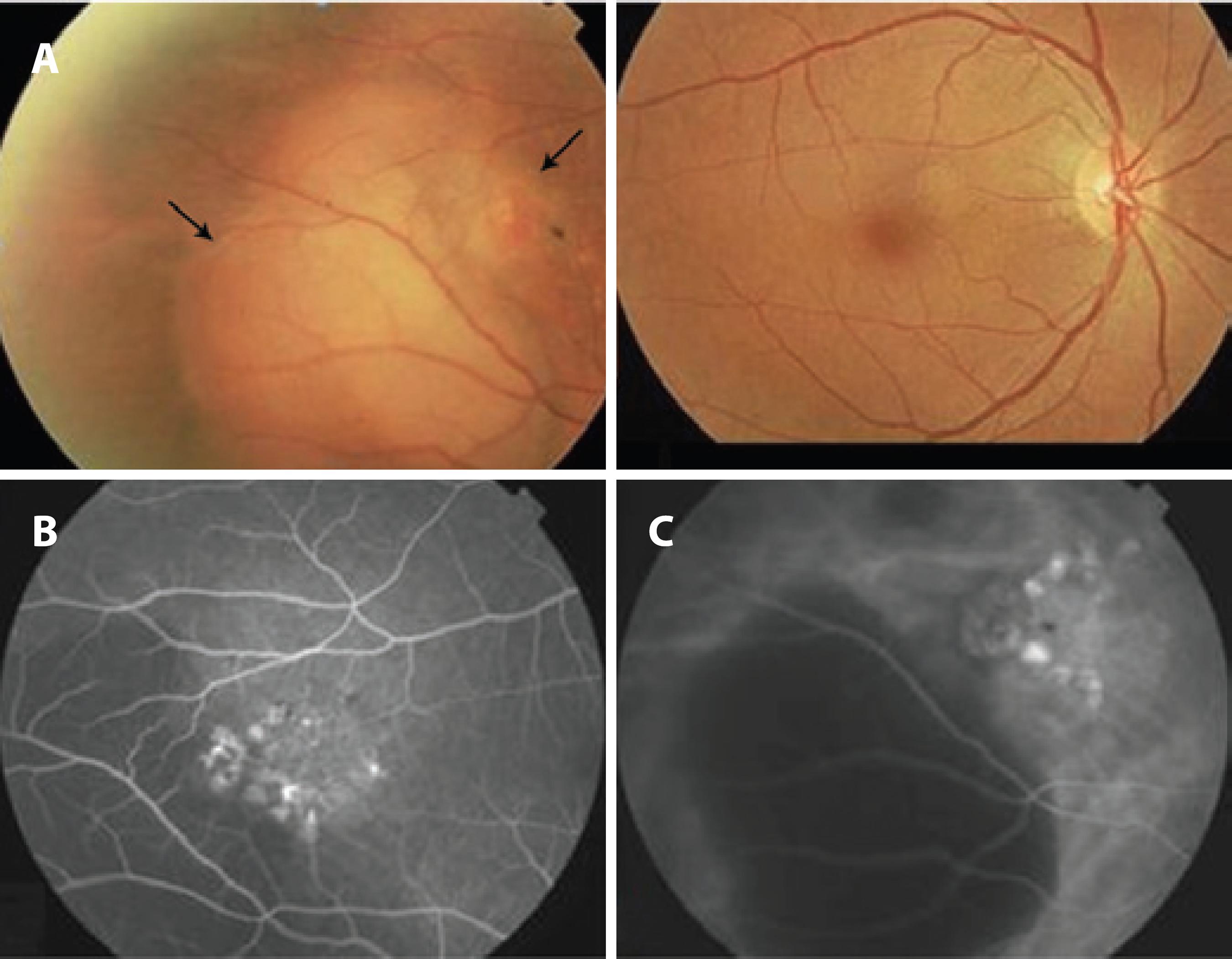 Figure 1. A) Fundus retinography demonstrating an elevated lesion in the mid-periphery of the inferior temporal vascular arcade, as shown by the long black arrow, and a lesion resembling the vascular tumor at the 2 o'clock position, as shown by the short black arrow. B) Right fundus. A middle phase of the fluorescein angiography showing minimal leakage and pooling. C) Indocyanine green angiogram showing the tubular elements ending in aneurysmal or polypoidal dilatations with little leakage of the dye. In both exams, the lack of fluorescence (i.e., black appearance) was due to major hemorrhagic pigment epithelium detachment.
