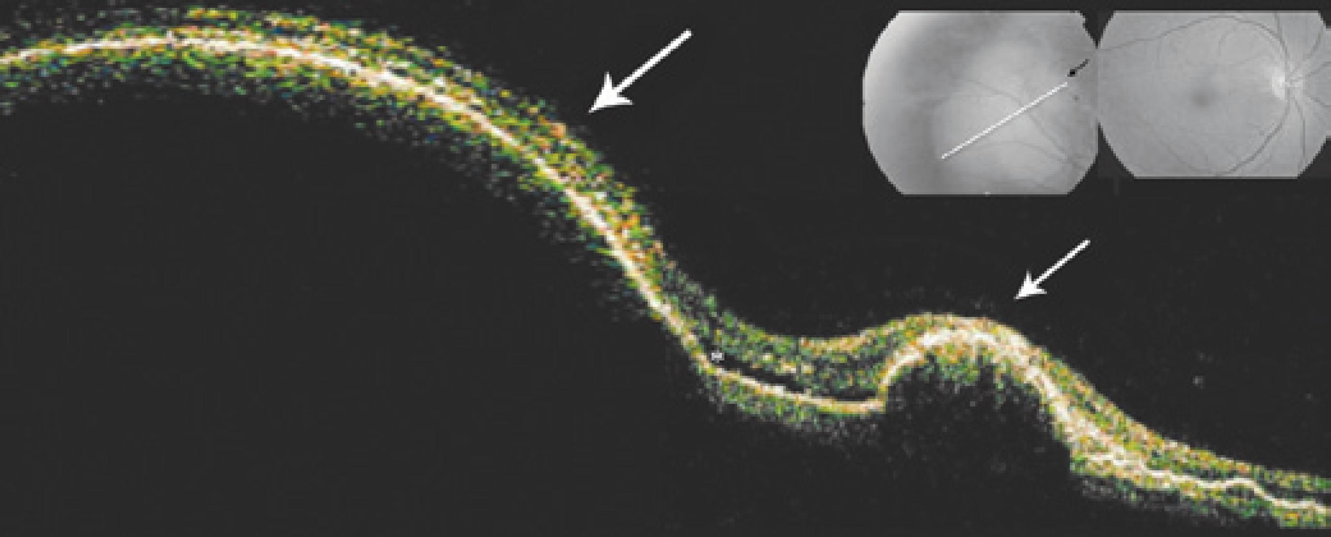 Optical coherence tomography (OCT) is another exam used to characterize the IPCV lesion(6), and is used mainly when retinal pigment epithelium and serous retinal detachment are suspected(7). However, this approach has not yet been described in peripheral IPCV.