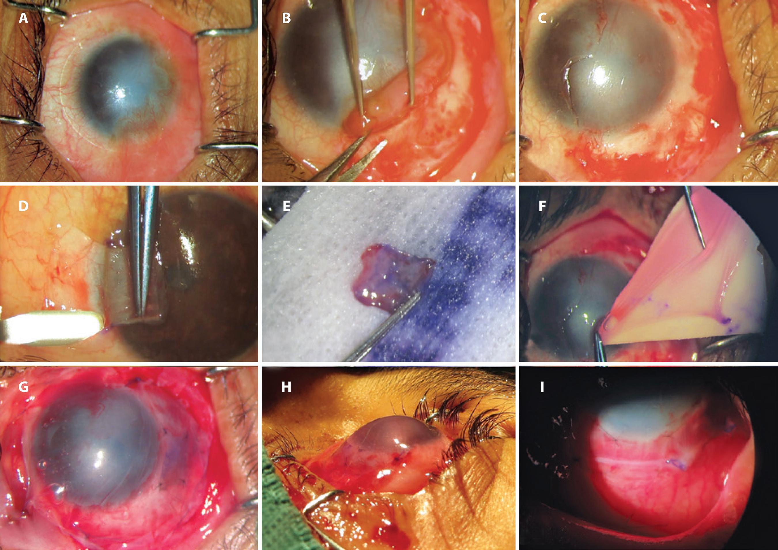 Figure 1 Surgical steps in a case of homologous limbal stem cell transplantation. A) preoperative photograph of a case of unilateral limbal stem cell deficiency; B) removal of fibrovascular tissue from corneal and scleral surfaces; C) underlying corneal and scleral bed preparation; D) autologous limbal tissue dissected from contralateral healthy eye at 6 o’clock position; E) autologous limbal tissue ready for transplantation; F) amniotic membrane transplantation; G) autologous limbal tissue sutured in place at 6 o’clock position under amniotic membrane transplantation (epithelial face down); H) immediate postoperative photograph; I) postoperative photograph on the seventh day.