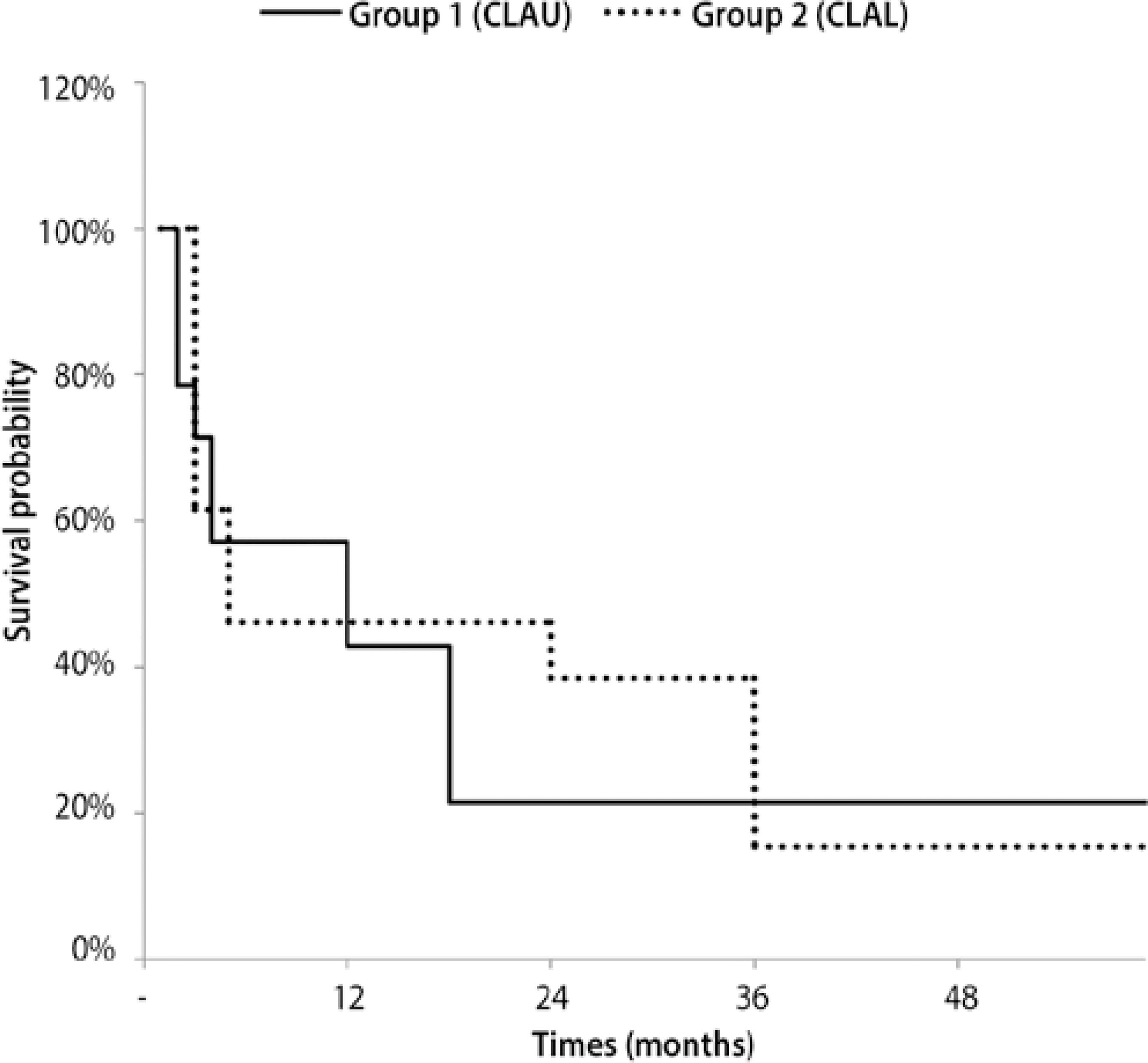 Kaplan-Meier survival analysis was applied to evaluate conjunctival limbal graft survival. In group I, graft survival was seen in six eyes (43%) at 1 year and in three eyes (21%) at 3 years, with a cumulative survival of 21% after a mean follow-up time of 18.36 months. In group II, survival was seen in three eyes (38%) at 1 year and in two eyes (15%) at 3 years, with a cumulative survival of 15% after a mean follow-up time of 35.04 months (Figure 2).