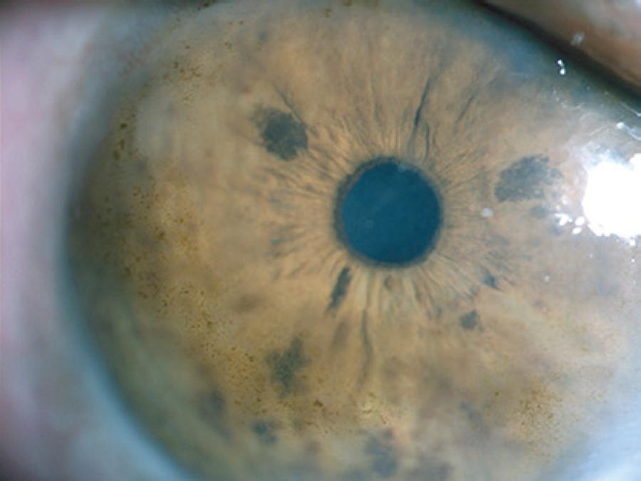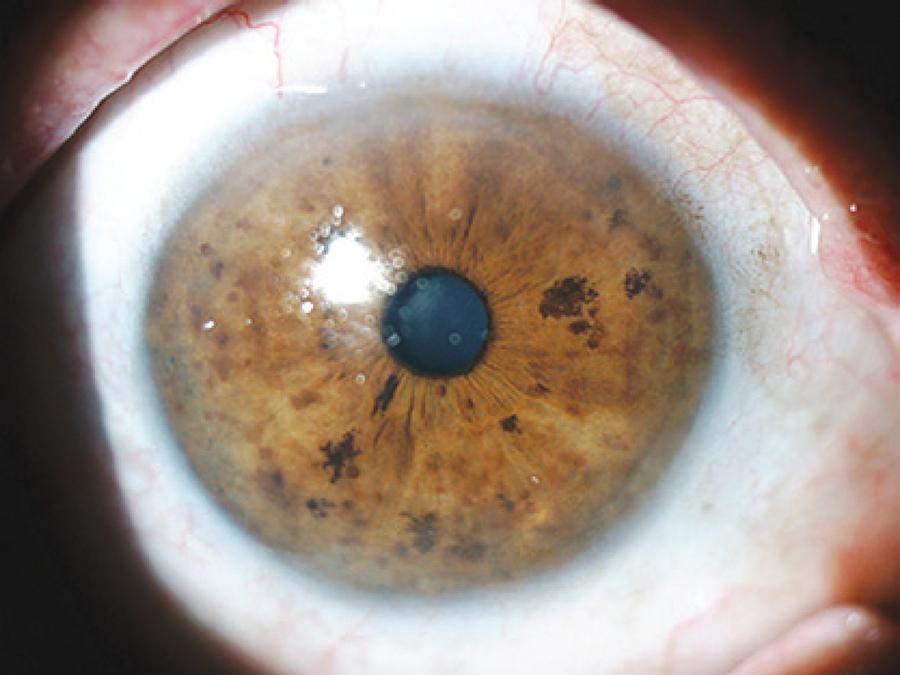 Small lesions of PAM are often managed initially by observation. Lesions with changes or extensive lesions should be biopsied. At least 35% of PAM lesions progress clinically, and at least 11% develop into melanomas within 10 years(1,4). PAM without atypia is not considered a premalignant lesion and does not require treatment. PAM with atypia carries a risk of malignant transformation. The extent of PAM, measured in clock hours, best correlates with the risk of transformation into melanoma(1,4). Small lesions (<1 clock hour) can be followed up by clinical observation. Larger lesions are generally treated by surgical excision and cryotherapy. Oral mucosal or amniotic membrane grafting may be required to fill defects after larger excisions. Unresectable or recurrent diffuse PAM with atypia is managed by mapping biopsies and cryotherapy or MMC and close clinical follow-up(1,4).