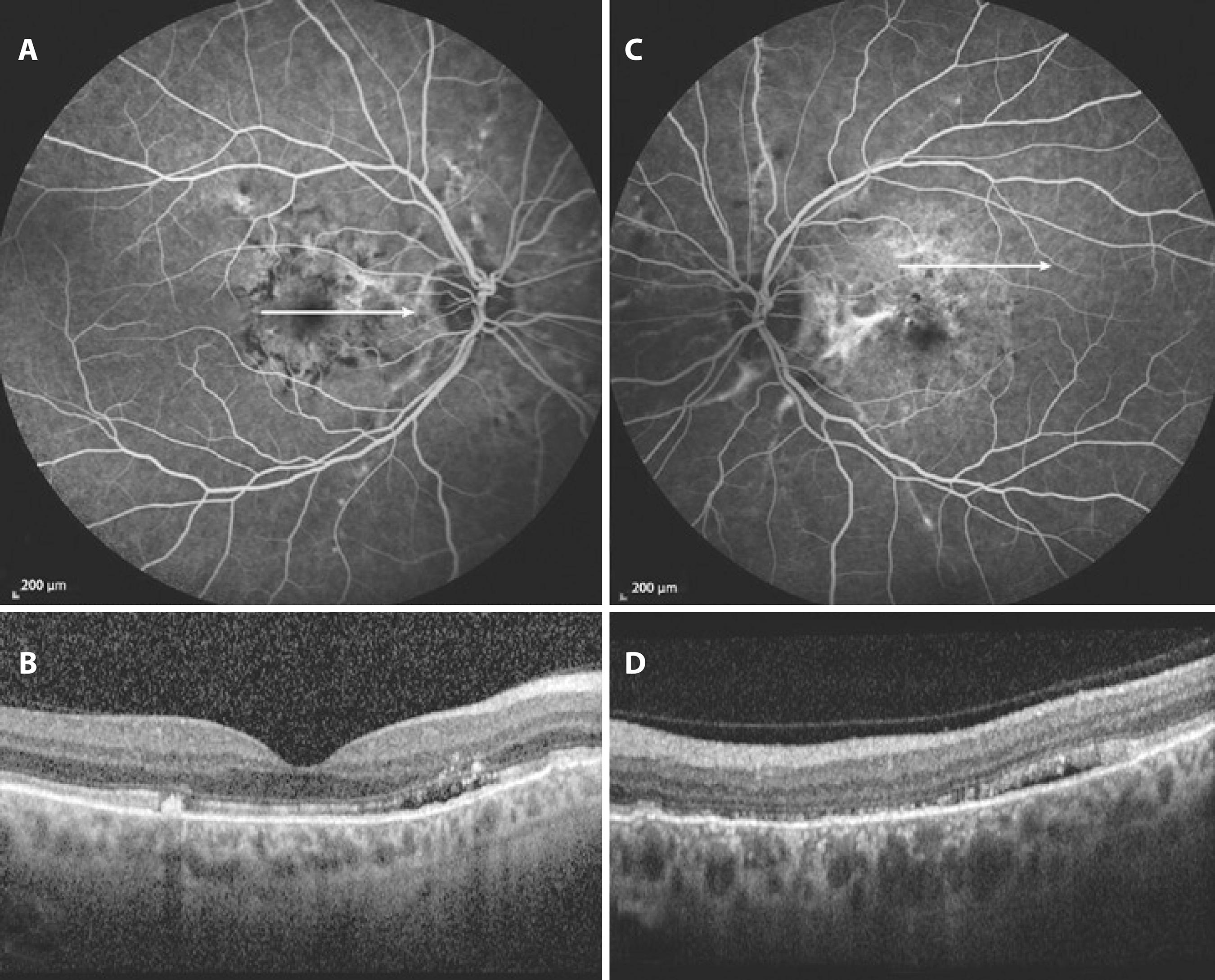 Figure 2 Fluorescein Angiography (FA) and SD-OCT images. (A) FA of OD, demonstrating hyperfluorescence in the foveal region (B) SD-OCT of OD, revealing minimal submacular fluid. (C) FA of OS, demonstrating staining between the optic disc and fovea, corresponding to a subretinal scar. (D) SD-OCT of OS, revealing minimal submacular fluid.