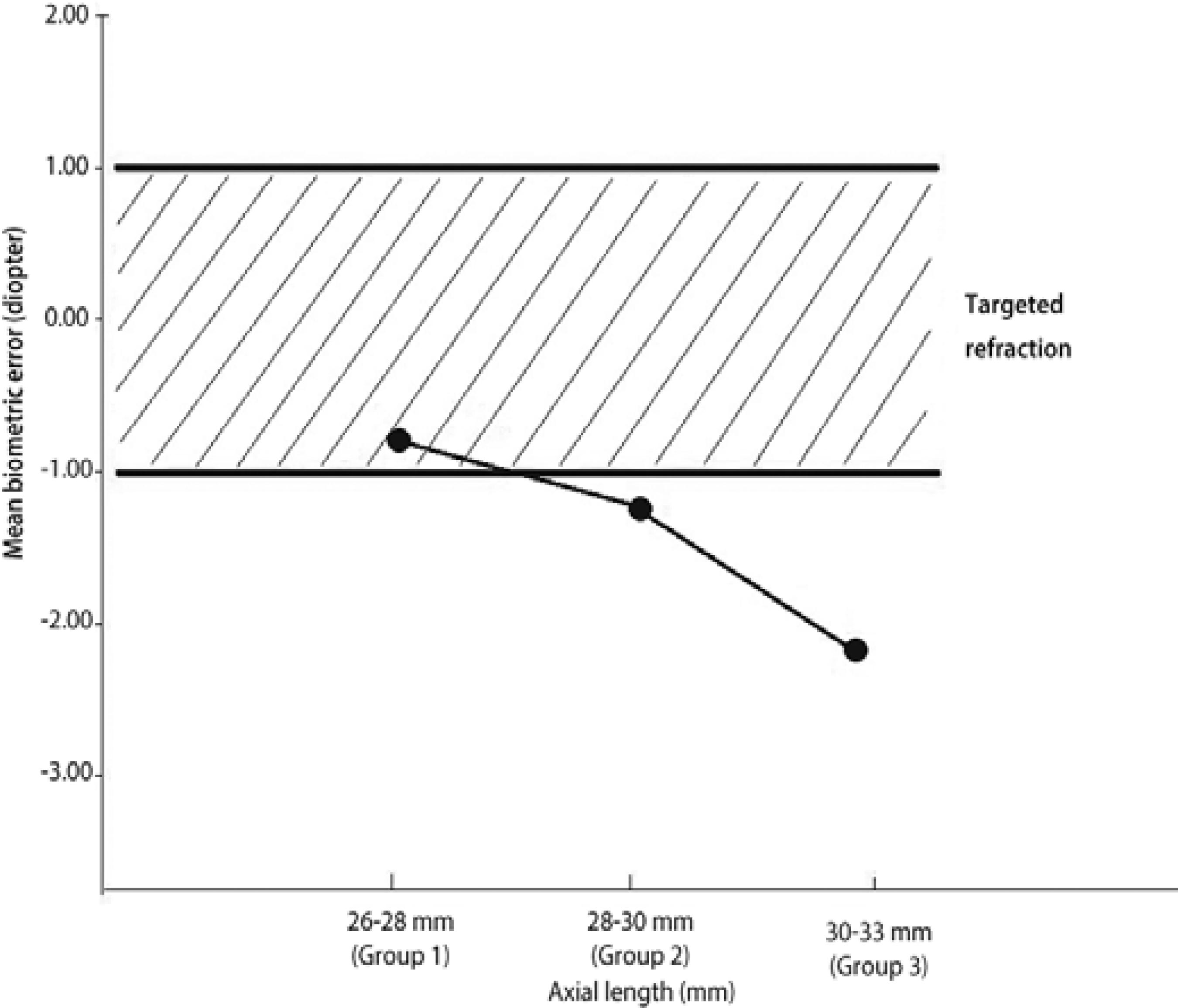 The SRK/T formula was used to determine the IOL power in the present study. We were unable to determine the definite causes of biometric error in our patients. Pupils were undilated during measurements, no patients had mature cataracts, and no patients had corneal scars or vitreous hemorrhage as patients with these disorders were excluded from the study. The biometric errors observed in the present study may be due to the formula used, because we did not optimize the constants and due to fixation instability resulting from myopic macular degeneration. In addition, preoperative corneal astigmatism may have affected the postoperative refraction despite the low rate of preoperative corneal astigmatism observed in the present study. Hyperopic errors are generally observed in patients with long axial lengths (more than 30 mm); however, in our study, we observed similar myopic errors in patients with long axial lengths compared with the other 2 groups, with a statistically higher mean biometric error in patients with long axial lengths compared with the other groups.