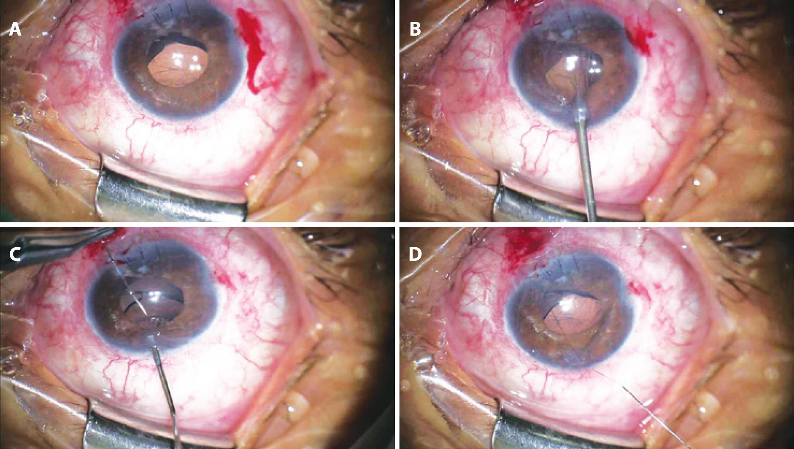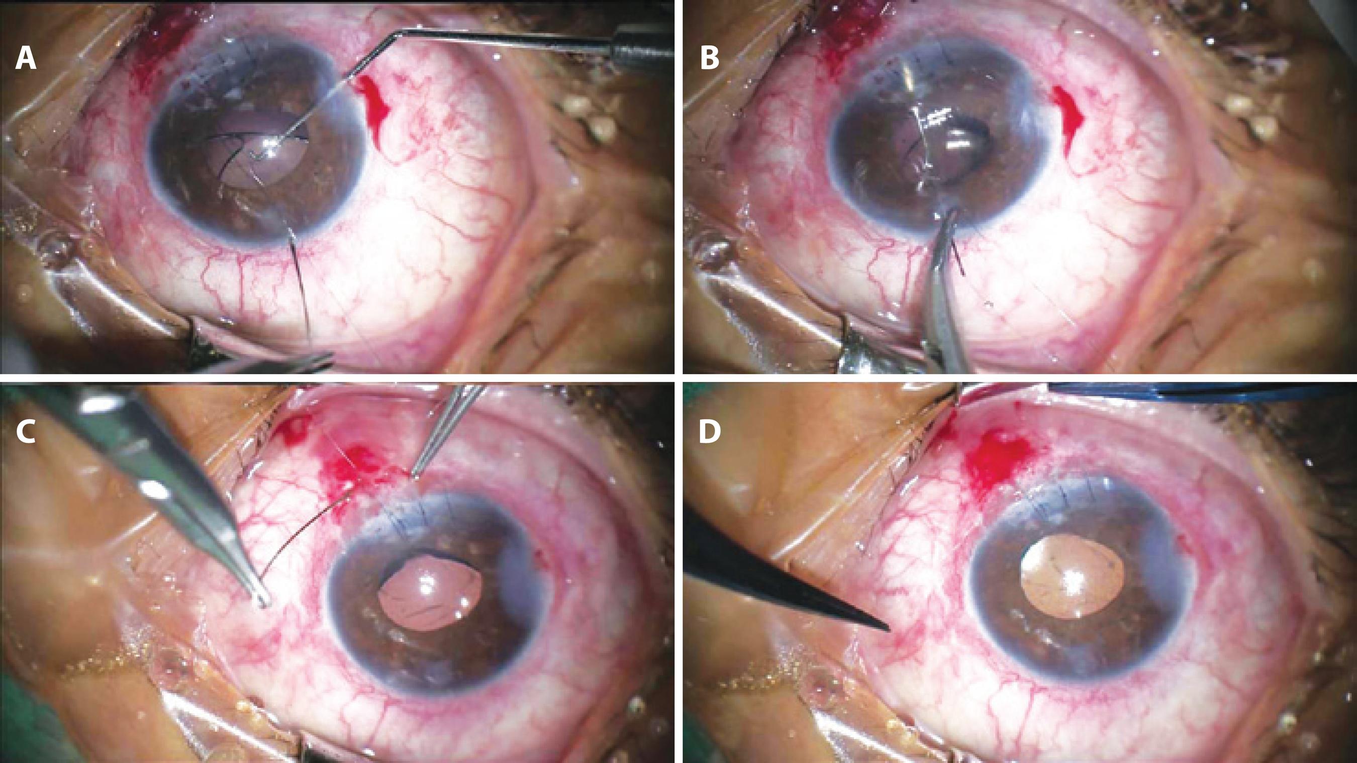 Figure 2 A) Needle re-introduced into the anterior chamber through 2 suture threads to form a knot; B) Needle passed superior to the haptic; C) Introduction of the needle into the sclera with a lamellar approach to tie suture ends (without scleral flap formation); and D) Postoperative centralization of the intraocular lens.