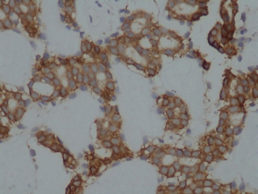 The cells covering the cystic spaces were arranged in two cell layers and had round, uniform nuclei; some with small, conspicuous, solitary nucleoli. Individual tumor cells had a scant amphophilic cytoplasm and high nuclear-to-cytoplasmic ratio (Figure 3). Mitotic activity was sparse and no perineural or lymphovascular invasion was observed. On immunohistochemical examination, the tumor cells stained positively for Cam 5.2 (low-molecular-weight keratin). The inner cell layer stained positively for CD117 (c-KIT), whereas the outer cell layer stained positively for smooth muscle actin (SMA; Figure 4). SMA expression in the outer cells was consistent with myoepithelial cell differentiation. Analysis of these pathological findings resulted in the diagnosis of PCACC.