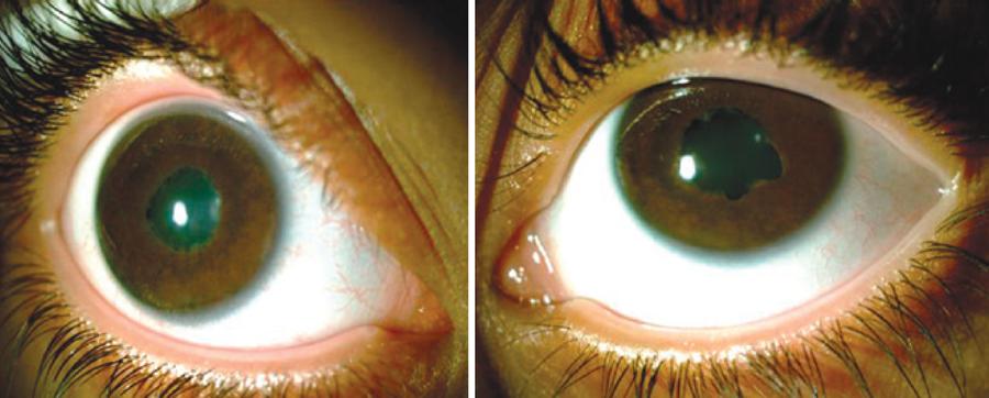 Biomicroscopy showed band keratopathy, granulomatous keratic precipitates, posterior synechiae, and opaque pupillary membranes, which bilaterally obstructed the lens evaluation in two girls, and also in one eye of the third girl who had undergone penetrating keratoplasty with graft failure in the fellow eye.
