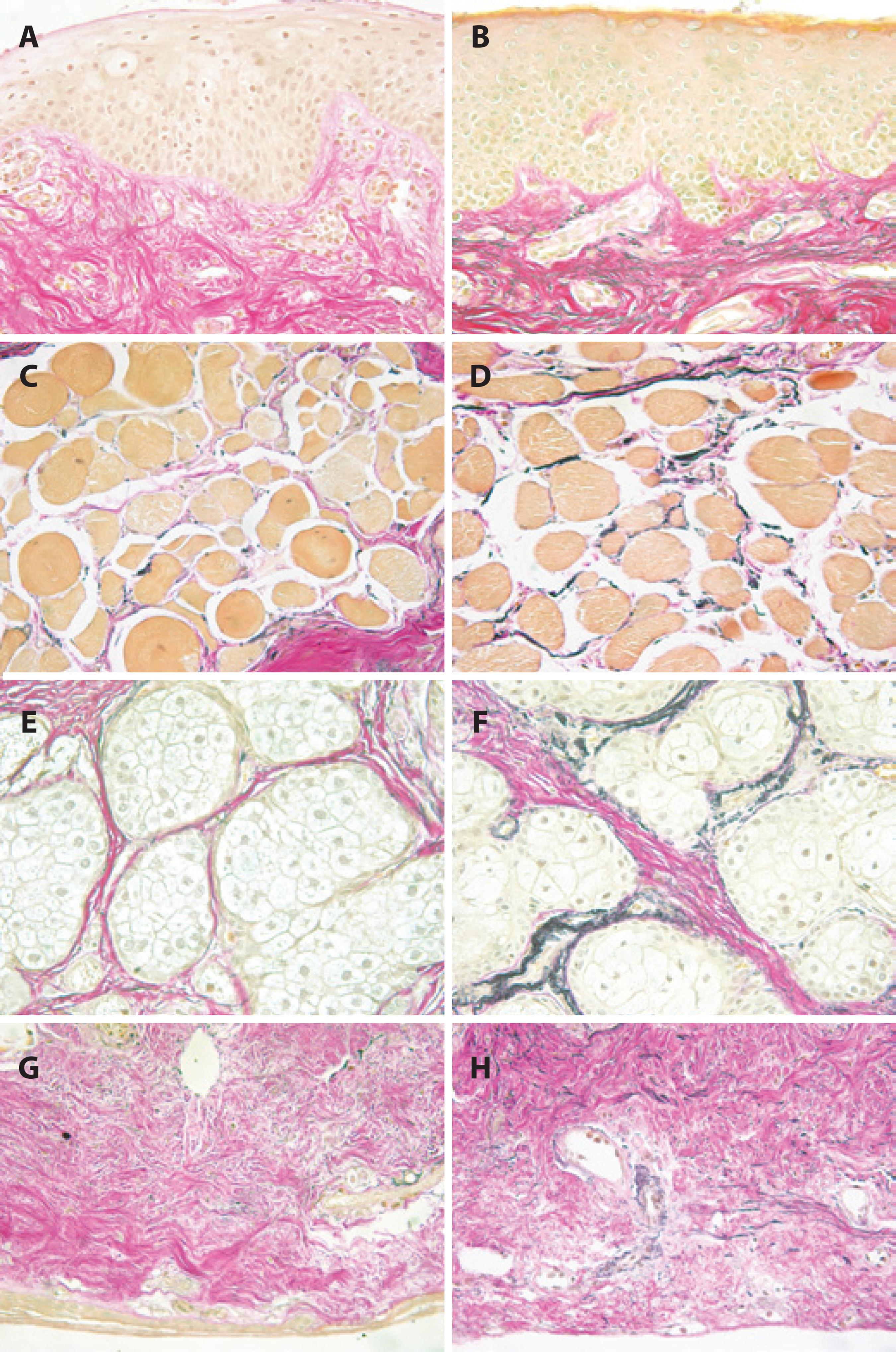 Figure 1 Histopathologic sections of full-thickness eyelid specimens obtained from the lateral lower eyelid of a 65-year-old male patient with involutional ectropion and lateral canthal tendon laxity (A, C, E, G) and controls (B, D, F, H) stained using van Gieson's method for elastic fibers. Elastic fibers appear dark-brown, collagen fibers appear red (Original magnification, 400×). A, B, C, D, Anterior lamellar regions with eyelid skin and pretarsal orbicularis oculi muscle show a nearly complete absence of elastic fibers in involutional ectropion (A, C) compared with control tissue (B, D). E, F, G, H, Posterior lamellar regions with perimeibomian tarsal stroma and intermeibomian tarsal stroma reveal a marked reduction of elastic fibers in involutional ectropion (E, G) compared with control tissue (F, H). (Modified from Reference 42).