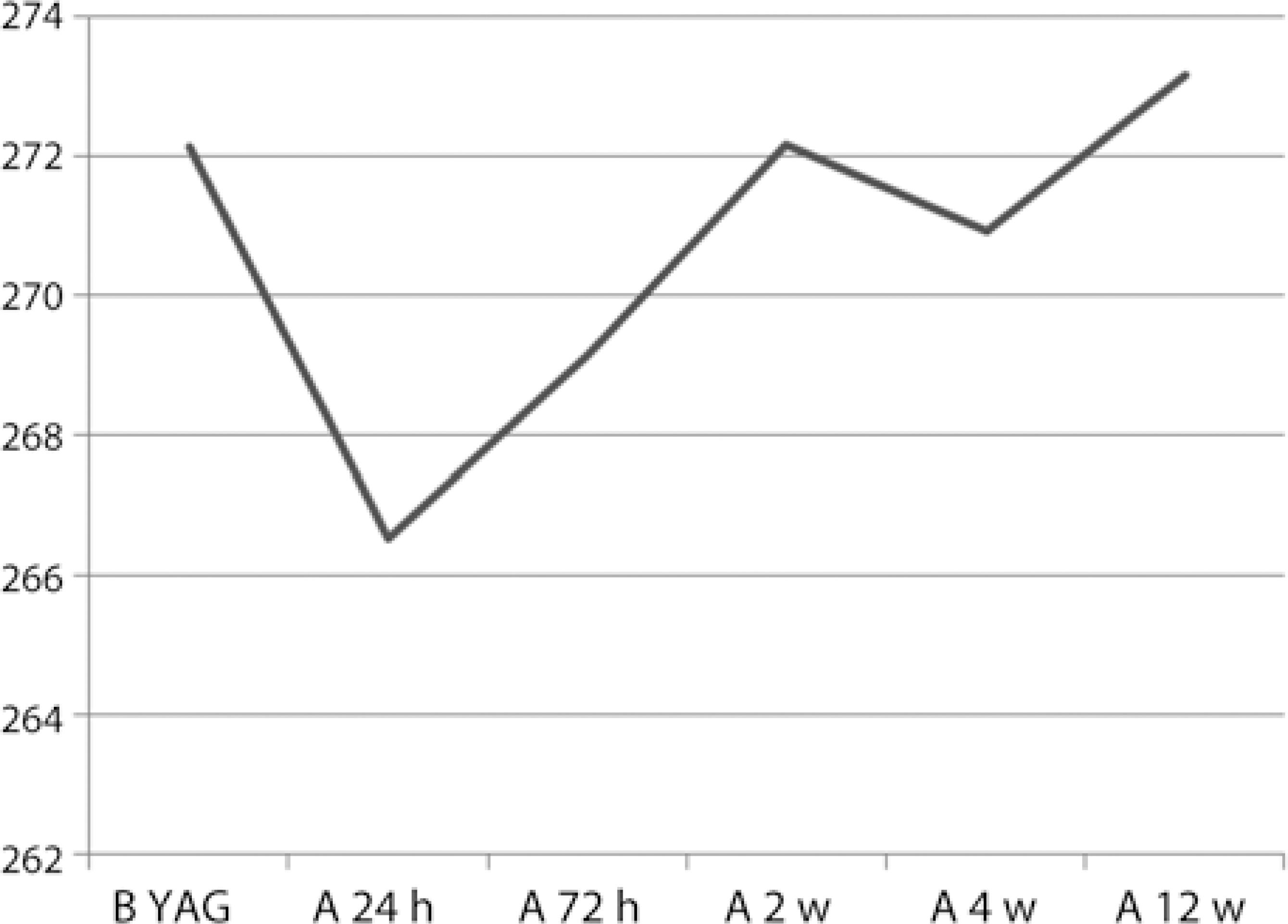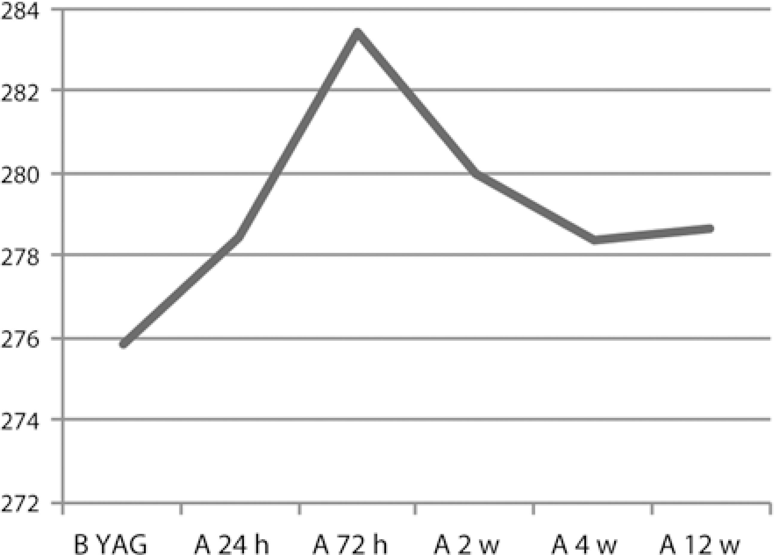 Image acquisition: The procedure for obtaining enhanced depth imaging (EDI)-OCT has previously been described(7). The central sub-foveal choroidal thickness (CEDI) was measured using spectral-domain OCT (Spectralis, Wave-length: 870 nm; Heidelberg Engineering Heidelberg, Germany) with the EDI modality. CEDI was defined as the vertical distance from the hyperreflective line of Bruch's membrane to the hyper-reflective line of the inner surface of the sclera. All subjects were imaged by the same experienced technician. Two independent clinicians measured CEDI, and the average of these measurements was used in the analysis. All scans were performed during the same time of the day, between 11:00-12:00, to minimize the possibility of CEDI changes attributable to diurnal CEDI fluctuations(8). Routine examinations and OCT measurements were repeated at 24 h, 72 h, 2 weeks, 4 weeks, and 12 weeks following the application of YAG capsulotomy.