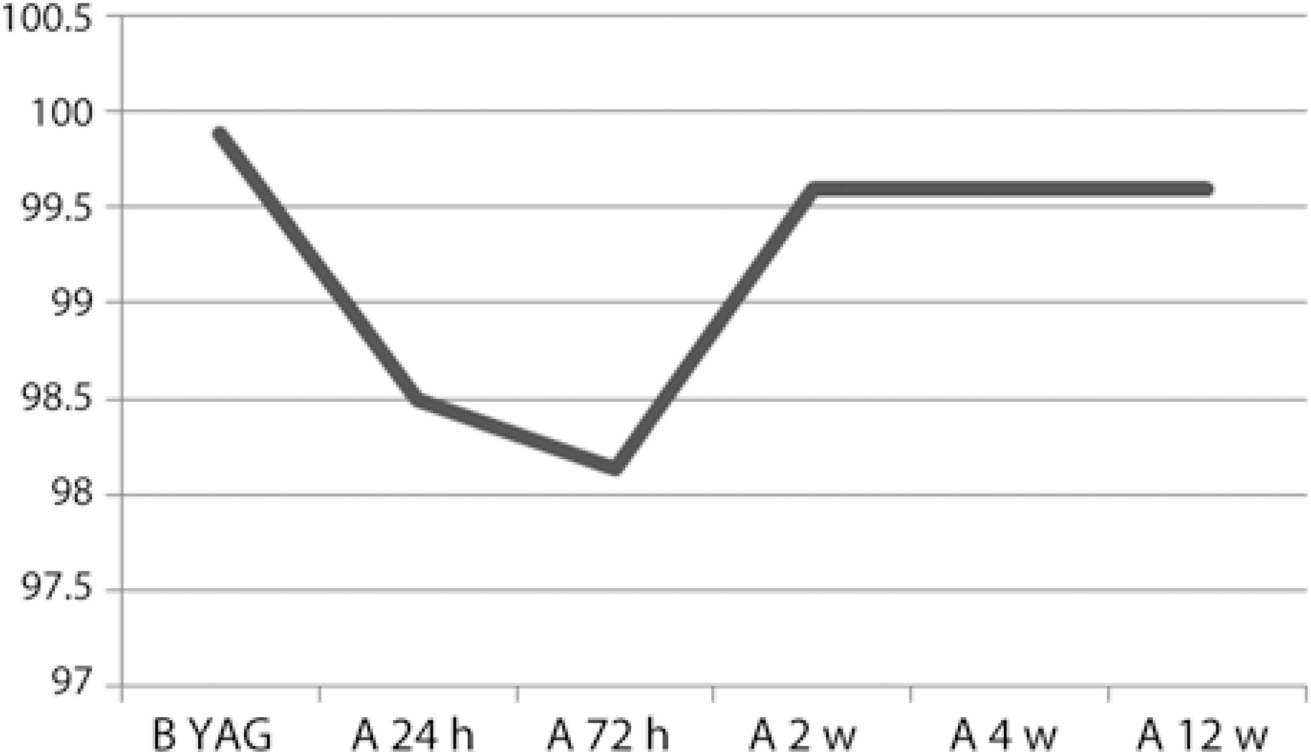 In one study, the authors stated that they did not detect any meaning ful increase in OCT measurements after laser capsulotomy for patients in whom the authors measured the thickness of the central macula with preoperative OCT(16). In our study, the measurements were repeated 24 h and 72 h after application to closely follow any potential inflammatory processes, and at the 2nd and 4th week after discontinuation of drug administration, and because of the possibility of disruption of the blood retinal barrier, the measurements were repeated at the 12th week in which week CME is observed most frequently. On the first day following YAG capsulotomy, an increase was observed in CMT. This rise had a tendency to recover on the 3rd day, and the values at week 2, week 4, and week 12, were similar to those observed on the first day. No statistically significant difference was observed during all these changes. Probably, a slight vasoconstriction occurred in the retinal vessels, and by that time, because no complication had developed, there was recovery.