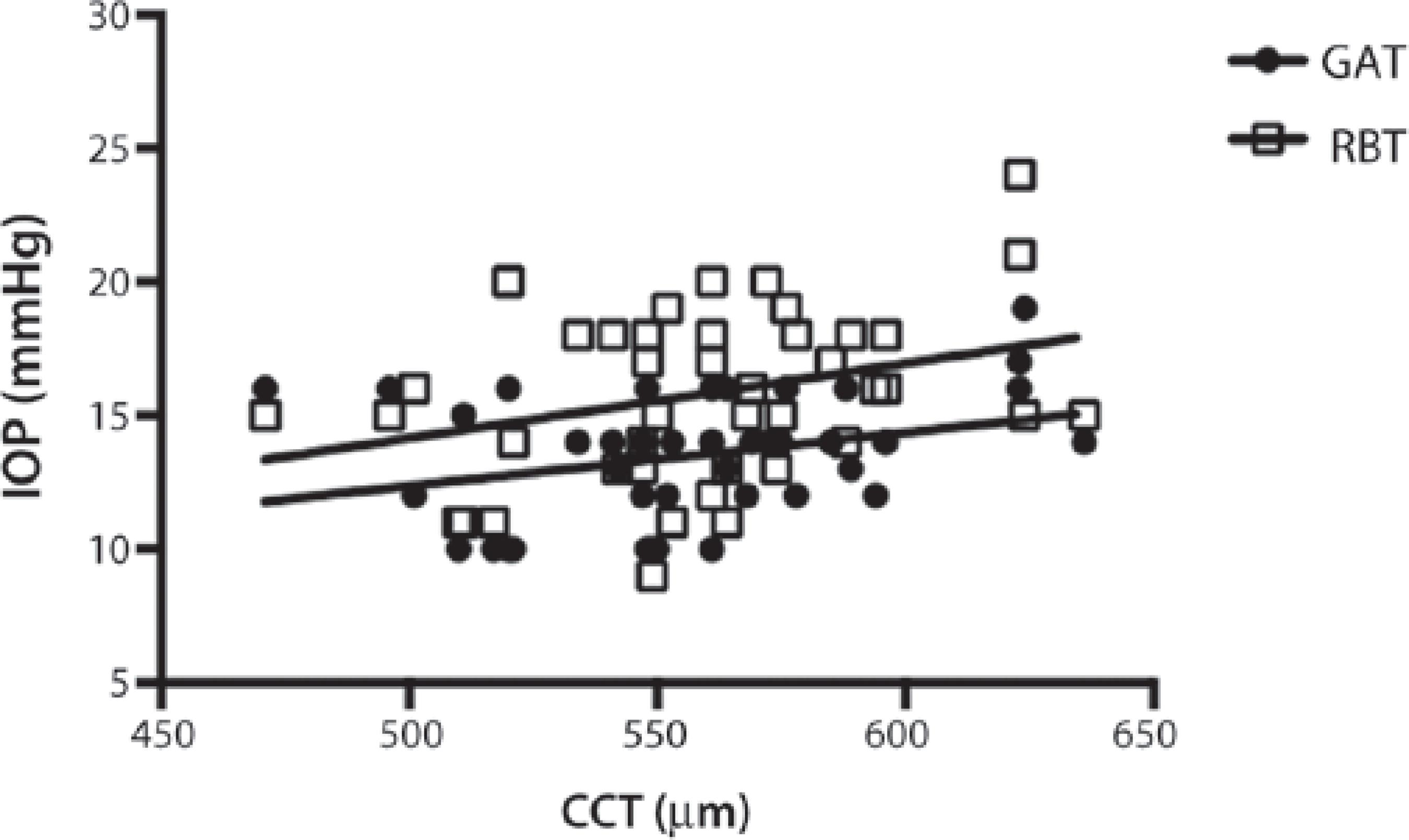 The mean CCT was 558 ± 36 µm, and a positive correlation was found between CCT and IOP for GAT (r=0.3163, p=0.0388) and RBT (r=0.3080, p=0.0445; Figure 2).