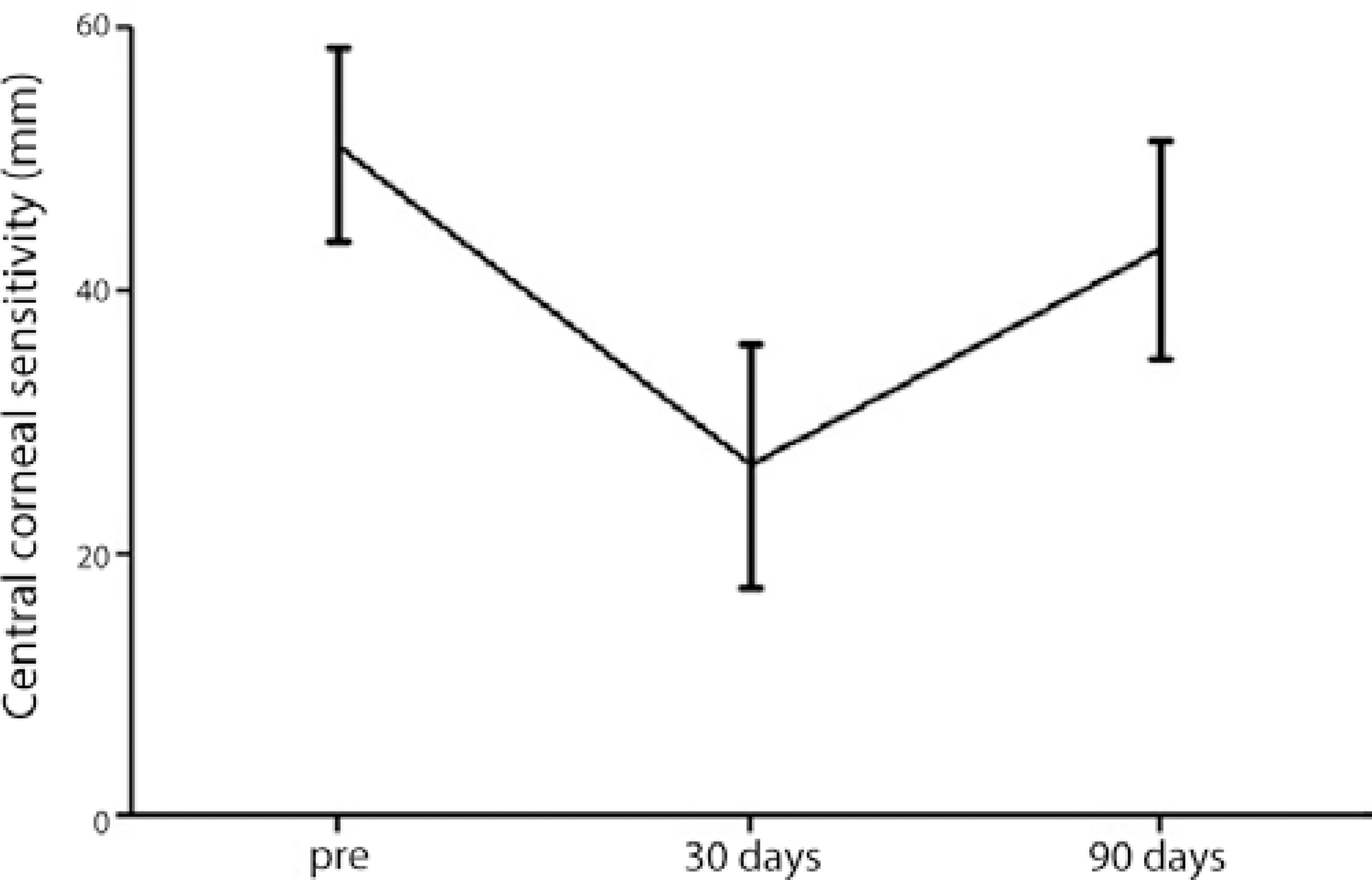 Figure 1 Mean measures of sensitivity in the central region of the cornea (mm) from the eyes of patients with standard deviations according to study time point.