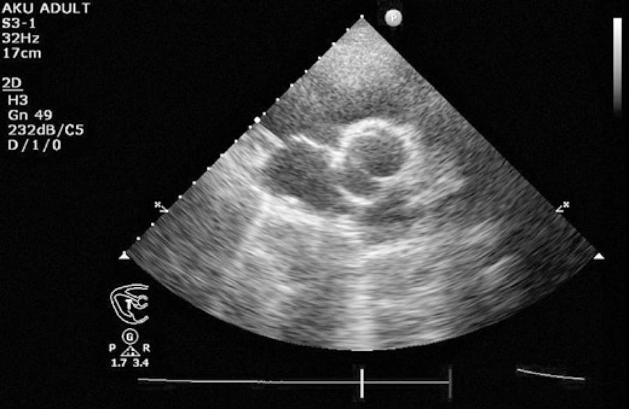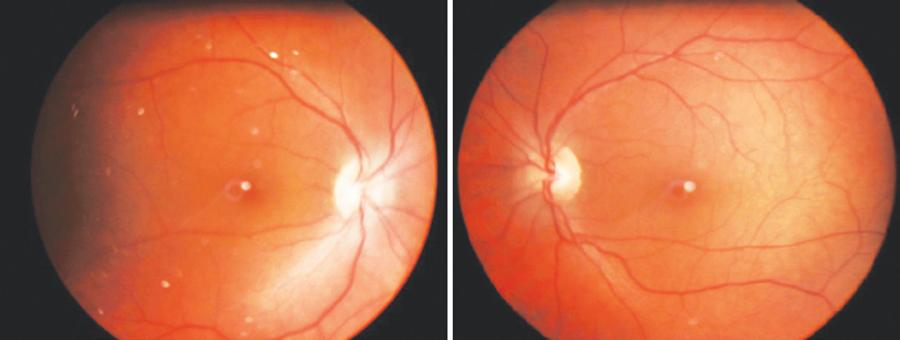 A 27-year-old female was admitted to our clinic with a complaint of decreased vision since childhood. Uncorrected visual acuity was 1/10 for both eyes. The best-corrected visual acuity was 2/10 in the right eye with -10.00/-5.00 × 165° diopter correction and 3/10 in the left eye with -7.00/-4.00 × 10° diopter correction. Ocular movements were normal. Intraocular pressure in both eyes as measured by Goldmann applanation tonometry was 14 mmHg. Anterior segment examination revealed a normal iris and no coloboma. After dilatation of the pupils, bilateral lens coloboma located in the inferior temporal regions was detected (Figure 1). Other ocular examinations, including fundus examination, fluorescein angiography, and optical coherence tomographic imaging revealed normal findings (Figure 2). Visual field testing using the 24-2 full-threshold strategy of the Humphrey Field Analyzer did not detect any defect. Medical and family histories were unremarkable. Because of the risk of an associated systemic disease, the patient was examined thoroughly by specialists in the departments of neurology, cardiology, internal medicine, and genetics. Neurology and internal medicine work-up did not reveal any abnormalities. Chromosomal analysis was normal, showing the 46 XX karyotype. In the cardiology work-up, echocardiography revealed a bicuspid aortic valve accompanied by an abnormal aorta (Figure 3). Coronary angiography or computerized tomographic angiography for imaging of other possible cardiac anomalies was not performed.
