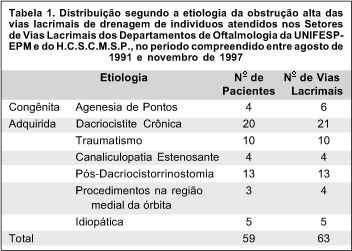 Na tabela 1, observa-se a etiologia da obstrução alta das vias lacrimais de drenagem. As etiologias mais freqüentes foram a dacriocistite crônica e pós-dacriocistorrinostomia que, em conjunto, foram responsáveis por 53,9% dos casos.