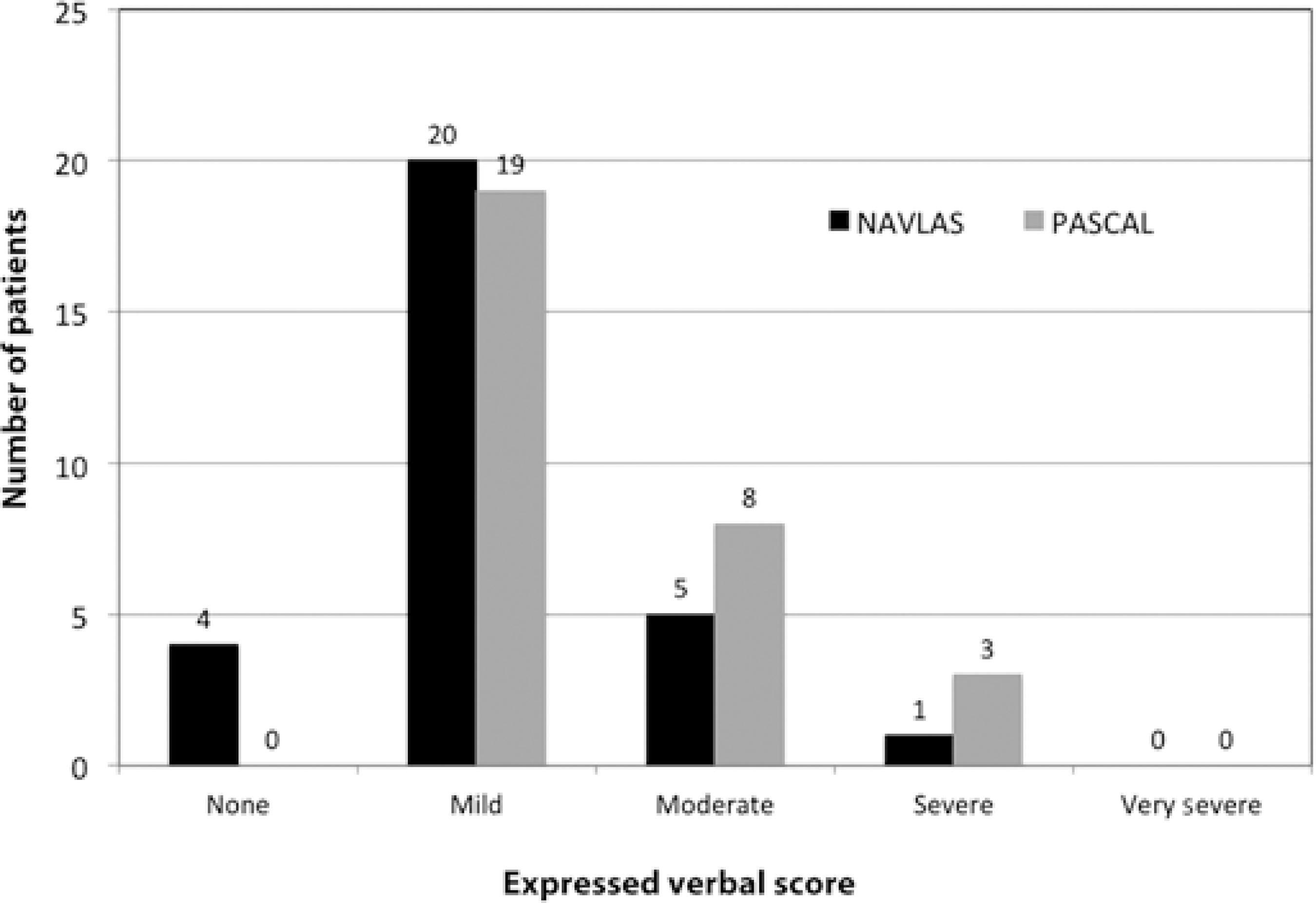 While no patients in the PASCAL group reported "no pain" in the VRS assessment, four (13.3%) in the NAVILAS group reported "no pain" associated with PRP application. A total of 11 of 30 patients reported experiencing moderate or severe pain during PASCAL laser treatment compared with 6 of 30 treated with the NAVILAS laser. None of the patients in either groups reported "very severe pain." Patient distribution according to VRS is presented in figure 1.