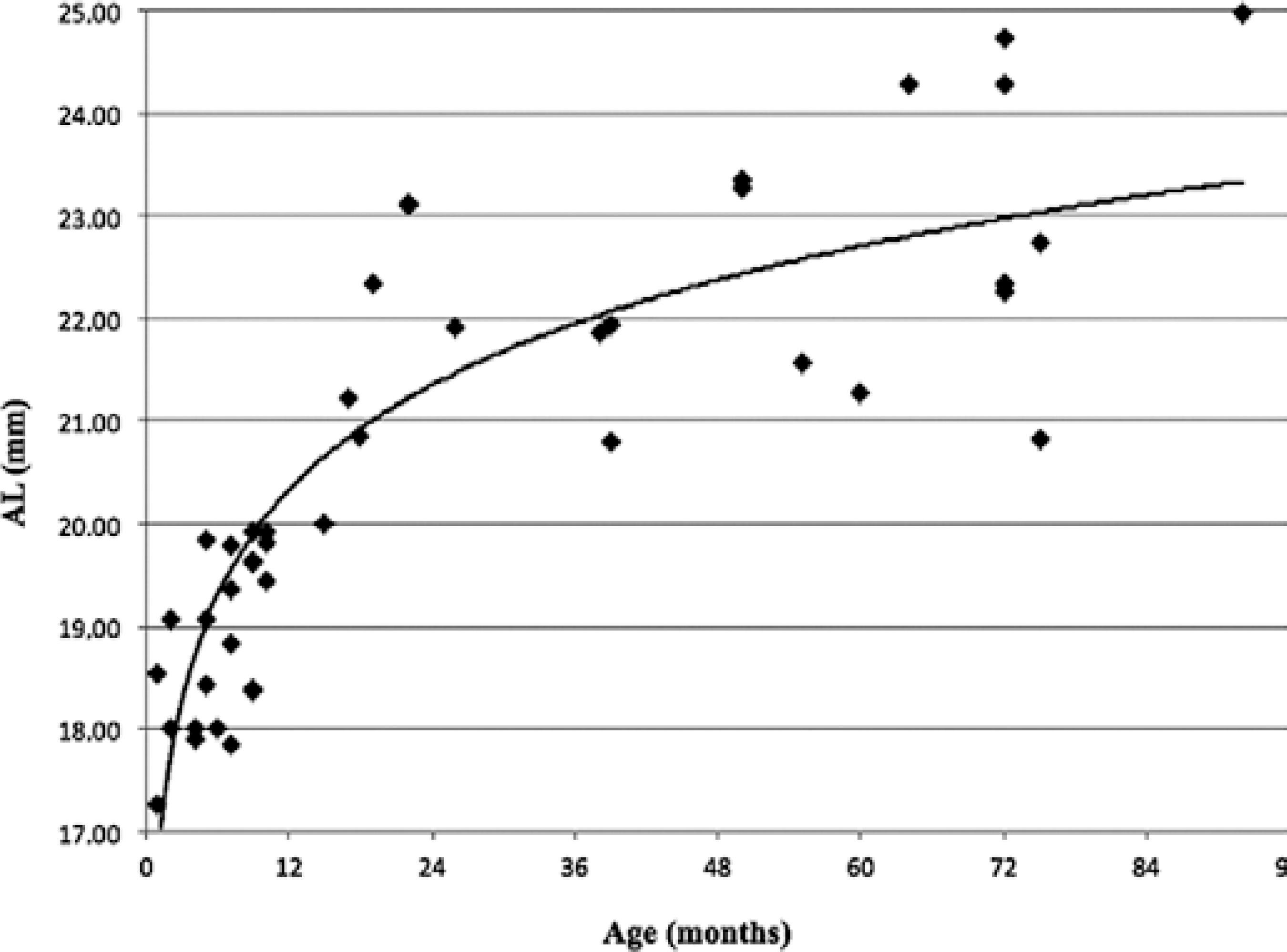 The assessment of the relationship between the child's age in months and the ocular biometric measurements was calculated with Pearson's correlations. The linear regression analysis using the logarithm of a patient's age as an independent variable was adjusted to obtain the estimates of the mean ocular parameters (K and AL). We considered P values <0.05 as statistically significant.