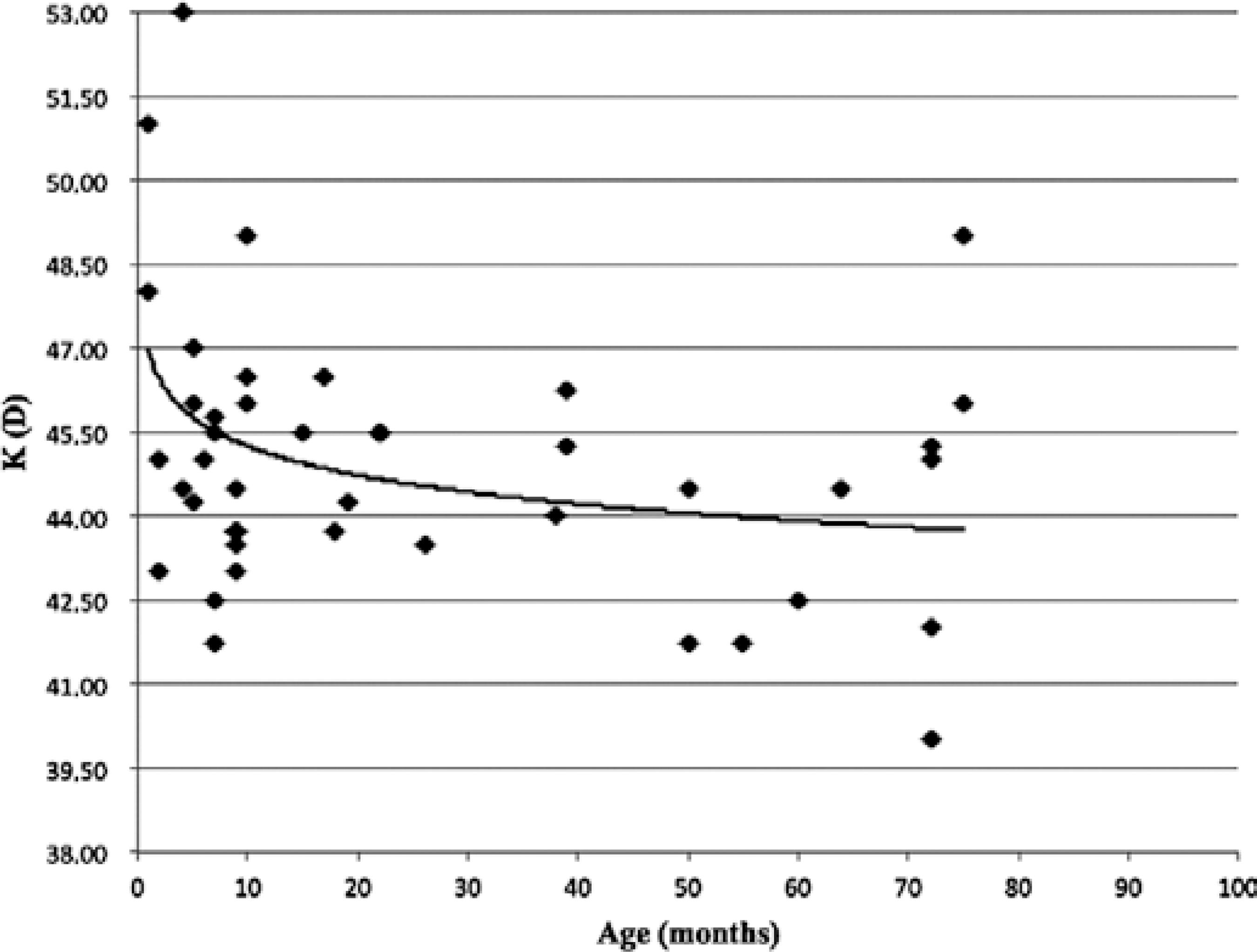 Several studies have demonstrated flattening of the K values in older children(11,15). A previous study reported mean K values of 47.50 D in newborns and 43.69 D in children aged 2-4 years and concluded that K values reach adulthood values at the age of approximately 3 years(16). In the present study, the eyes with congenital and developmental cataract showed K values that were significantly more curved in children younger than 6 months old. Although it presented a poor correlation (R2=0.14), the value of K was inversely related to the ages of the children up to 18 months. After this age, corneal flattening tends to stabilize.