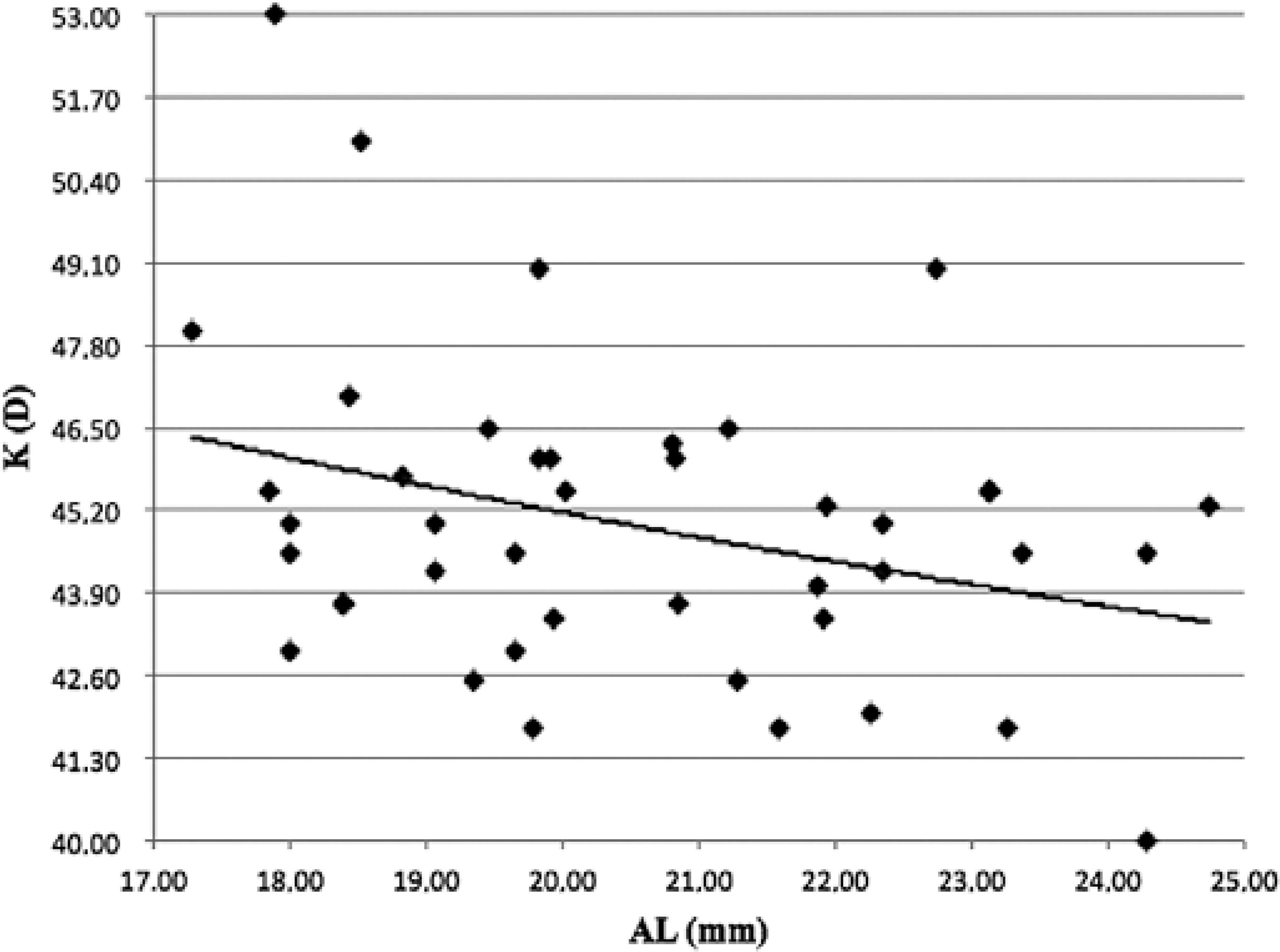 The dispersion values of AL according to K and the inverse relationship between them are shown in figure 3. The equation provided for the graph is K=52.91 -0.385 × AL (mm), withR2=0.11 (P< 0.05).