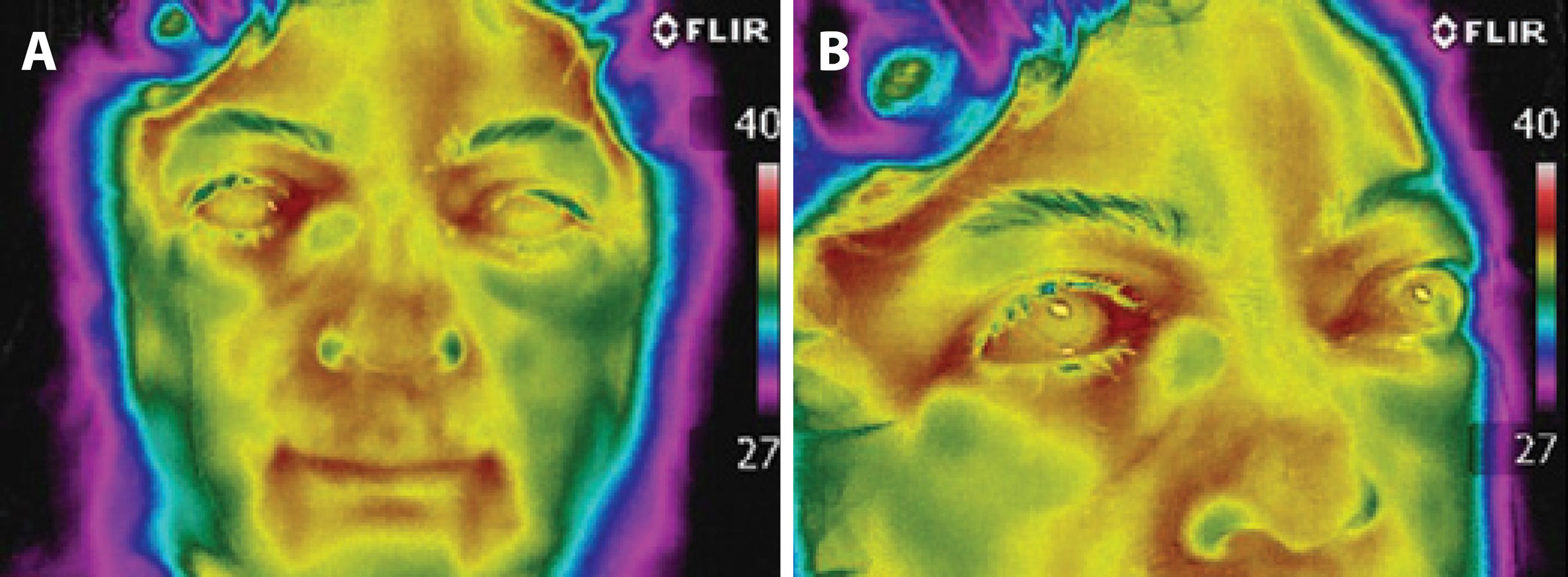 The room temperature was maintained at 23°C throughout the evaluation and the images were captured 15 min after the temperature of the patient's face matched the temperature of the environment (thermalization). One drop of saline solution (sodium chloride 0.9%) cooled to 18°C had been previously applied to both eyes; a sequence of thermographic images was then shot with the eyes open 3 s after a blink. Care was taken not to allow excessive saline solution to run onto her face, thus preventing any thermal artifact from interfering with the local thermographic images. The camera allowed image magnification of up to eight times and fusion of the thermal and visual images in 3D mode, with optimal heat contrast that corresponded with the photographic image.