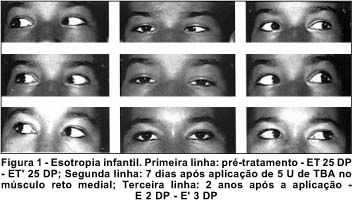 Por isso, o objetivo do presente trabalho foi comparar a eficácia das três formas de tratamento (aplicações unilaterais e bilaterais de toxina botulínica e a cirurgia) quanto ao percentual de correção do desvio ocular e ao índice de sucesso terapêutico (definido como desvio residual de até 10 DP).