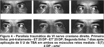 Todos os resultados foram considerados significativos a um nível de significância de 5% (p < 0,05). Os resultados quanto ao percentual de correção do desvio ocular horizontal, para longe e perto, podem ser vistos nas tabelas de 1 a 4, e os resultados quanto aos índices de sucesso terapêutico, nos gráficos 1 e 2. As figuras de 1 a 4 exemplificam casos comitantes e paralíticos, tratados com injeções uni e bilaterais.