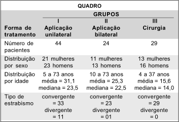 A maioria dos trabalhos publicados relata a eficácia da toxina para determinado tipo de desvio ocular. Não foi encontrado na literatura qualquer trabalho que selecionasse os pacientes pelo tamanho do desvio ocular, apesar de existirem alguns que relatem melhores resultados com desvios de pequenos e médios ângulos(3, 9-10). Também não se encontrou qualquer estudo que comparasse a injeção unilateral com a bilateral, apesar de alguns autores relatarem os resultados com a injeção bilateral(1,9,11-12). Resolvemos, então, comparar as três formas de tratamento, dividindo os pacientes em três grupos que foram considerados homogêneos pela análise estatística. Não subdividimos o grupo III em cirurgias unilaterais e bilaterais, porque apesar de ser ainda um assunto polêmico, vários trabalhos comprovaram que não há diferenças estatisticamente significativas entre as duas modalidades de cirurgia para a maioria dos desvios oculares(13).