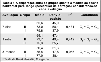 A comparação entre a evolução da medida do desvio horizontal, para longe e para perto, dos percentuais de correção do desvio e do índice de sucesso terapêutico entre os três grupos, mostrou que eles foram semelhantes, não havendo diferenças estatisticamente significativas.