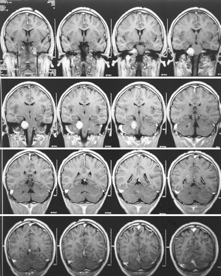 After surgical treatment of acquired restrictive strabismus, the child described remained stable with no other symptoms for approximately 7 years. By the age of 14 years, he developed left hand palsy and skin tumors. One year later, he started experiencing the beginnings of a hearing loss. Magnetic resonance imaging (MRI) of the brain revealed bilateral tumors indicative of vestibular schwannoma (Figure 1).