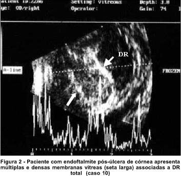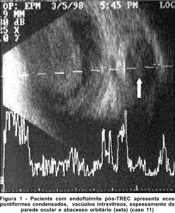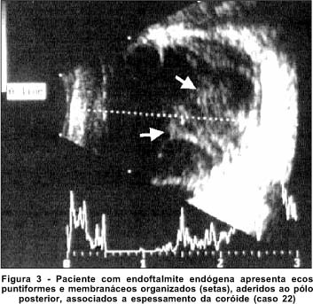 Num estudo de 11 casos de endoftalmite, os autores relataram a presença de debris e membranas no vítreo, e de descolamento da membrana hialóide posterior. Os debris eram mostrados como ecos múltiplos, esparsos ou puntiformes, dispostos por toda a cavidade vítrea(1).