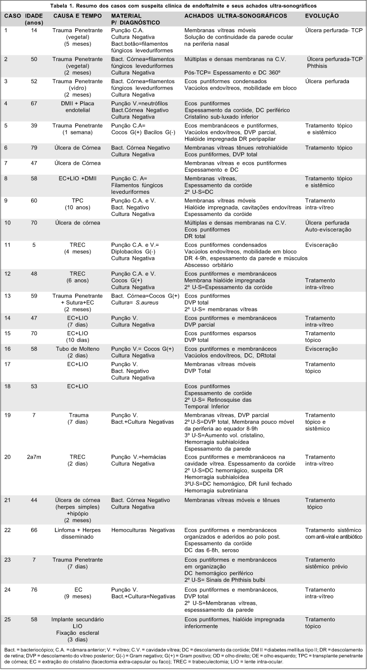 No período foram avaliados 25 pacientes com suspeita clínica de endoftalmite e cujos exames do polo posterior estavam impossibilitados pela opacidade dos meios.