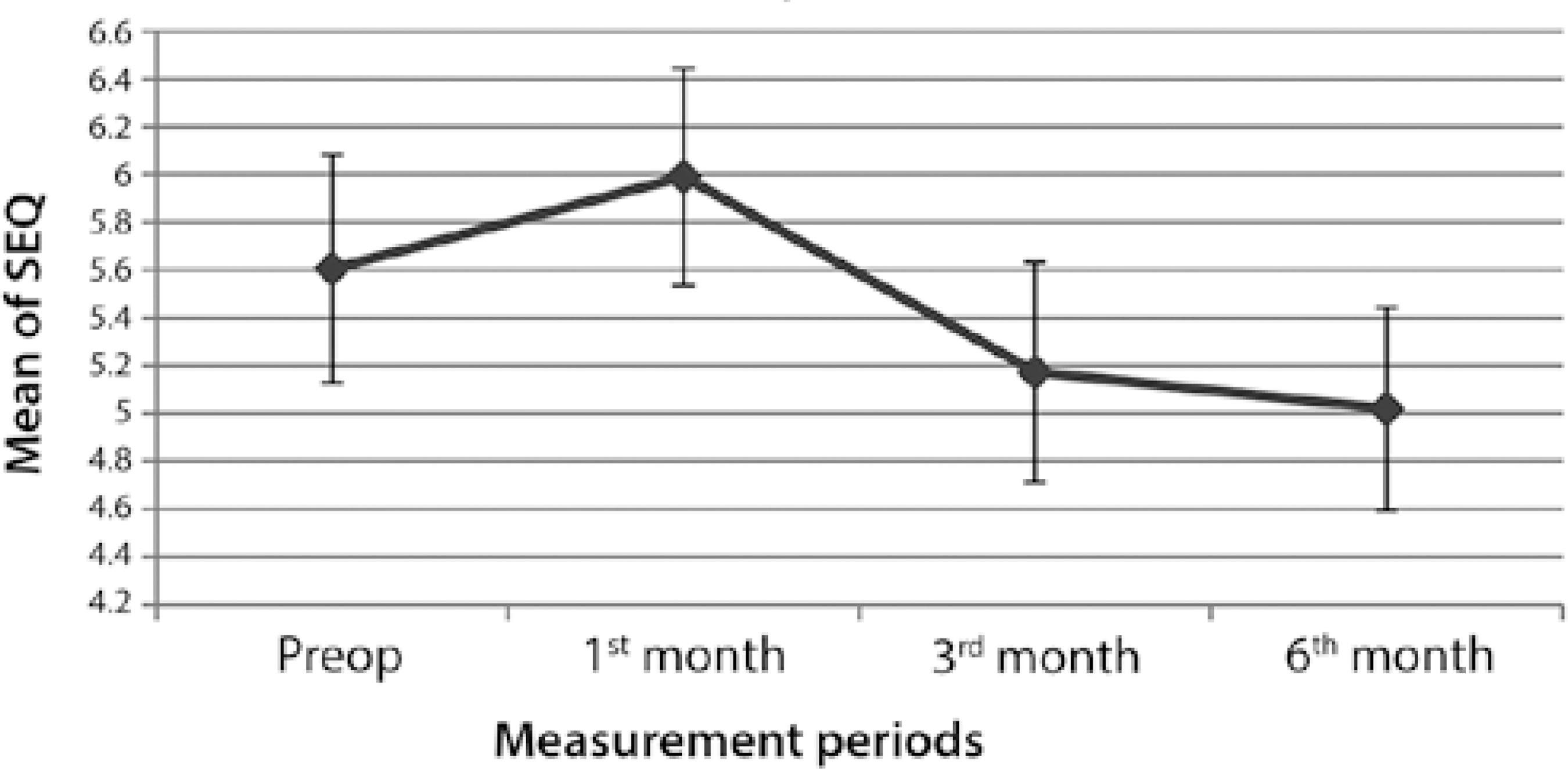 All variables were found to be normally distributed according to the Kolmogorov-Smirnov test. The statistical power analysis yielded a power of approximately 35%. The Friedman two-way analysis of variance test was used to compare preoperative and postoperative data. Following a Bonferroni correction, a p value of <0.0083 was considered statistically significant in comparison tests.