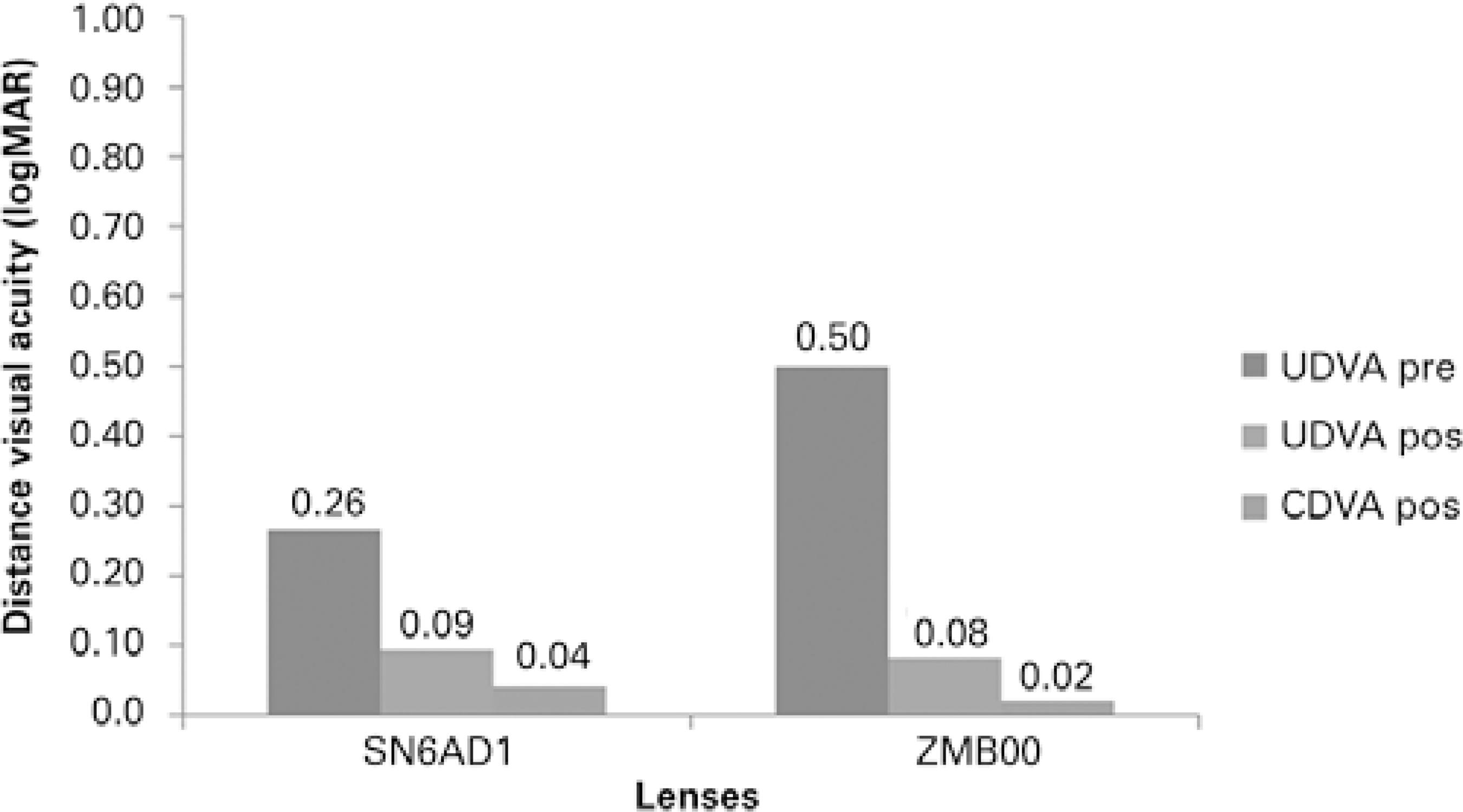 Figure 1 Preoperative long-distance visual acuity without (UDVA) correction, versus post-operative UDVA versus postoperative visual acuity for long-distance with (CDVA) correction for SN6AD1 and ZMB00 lenses.