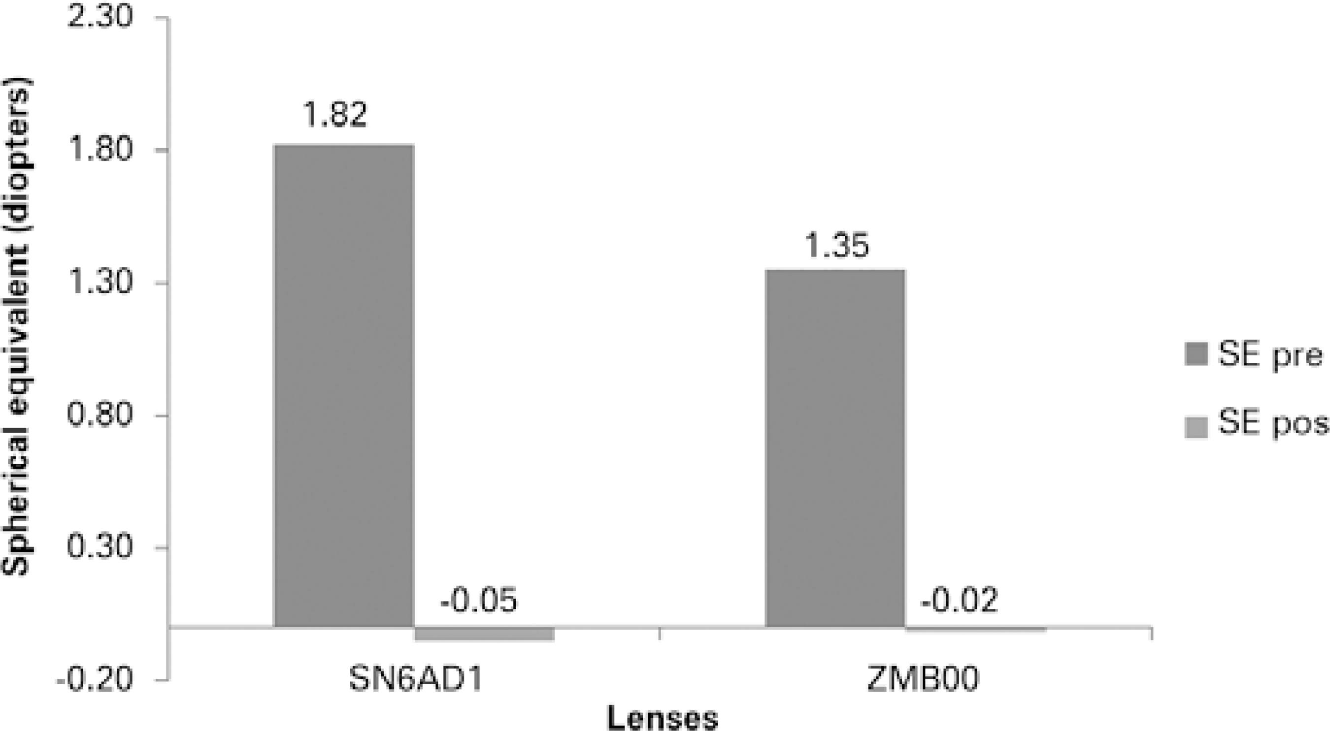 Considering short-distance vision, there was a significant difference in the average short-distance visual acuity, as analyzed with correction for long-distance (DCNVA) between the SN6AD1 and ZMB00 groups (0.04 vs. 0.09 logMAR, p=0.009), and in intermediate vision (0.17 vs. 0.54 logMAR, p=0.000) (Table 1 and Figure 1). Preoperative and postoperative spherical equivalent (SE) results are demonstrated in figure 2.