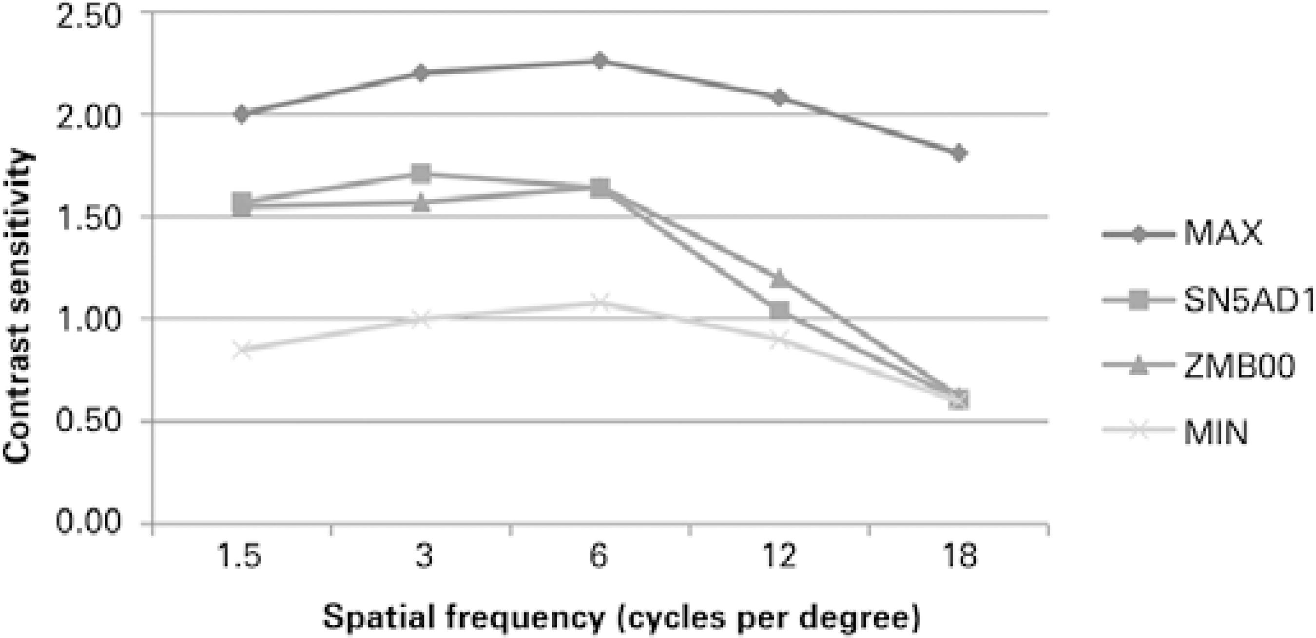 CS under photopic conditions without glare was better at a low frequency (1.5 cpd) for the SN6AD1 lens (p=0.039) and at a high frequency (18 cpd) for the ZMB00 lens (p=0.62). Under photopic conditions with glare, the ZMB00 lens performed better at high frequencies (18 cpd) with p = 0.003. Under mesopic conditions, the lenses exhibited similar behavior (p>0.05) (Figures 3, 4, and 5).