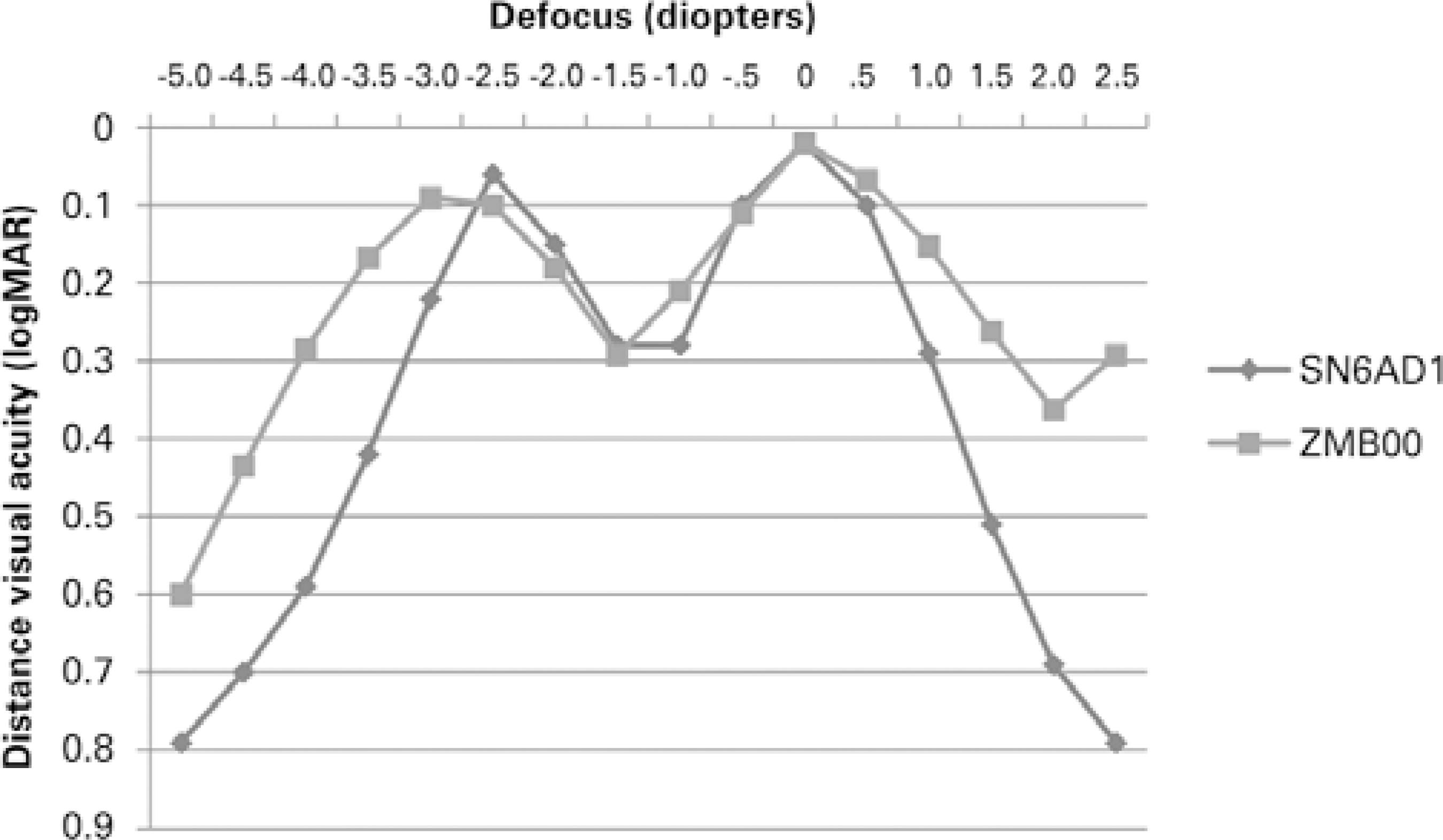 Considering visual defocus curve, it was clear that both groups reached two peaks of improved visual acuity corresponding to near and far distances. Considering near vision, significantly better vision was found close to 33 cm with the ZMB00 lens than with the SN6AD1 at this point, although the SN6AD1 lens demonstrated greater near vision at a 40-cm reading distance, but with no statistical significance when compared with the ZMB00 lens at this focus point. This is a different result from what was found at the near visual acuity test and may be related to pupillary function that improves the near visual acuity for refractive-diffractive hybrid design lenses.