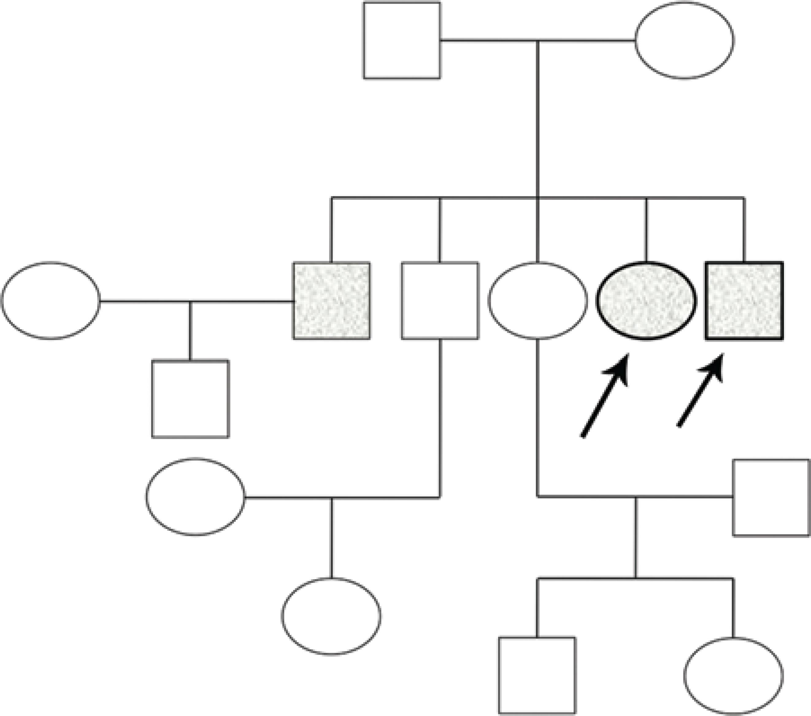 Figure 1 Family heredogram. Filled symbols represent affected individuals and unfilled symbols represent unaffected individuals; squares represent men, and circles represent women. Arrows represent the two cases.