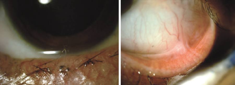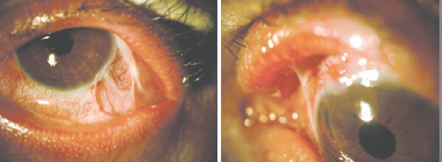 The first patient was referred for long-term ocular symptoms probably associated with prolonged conjunctivitis, which could explain the fornix shortening, symblepharon, and upper eyelid fibrosis with entropion. Meibomian gland dysfunction may explain the inferior keratitis, which was supported by the reduced BUT. Schirmer's test would have been important for the evaluation of tear secretion but could not be performed in case 1.