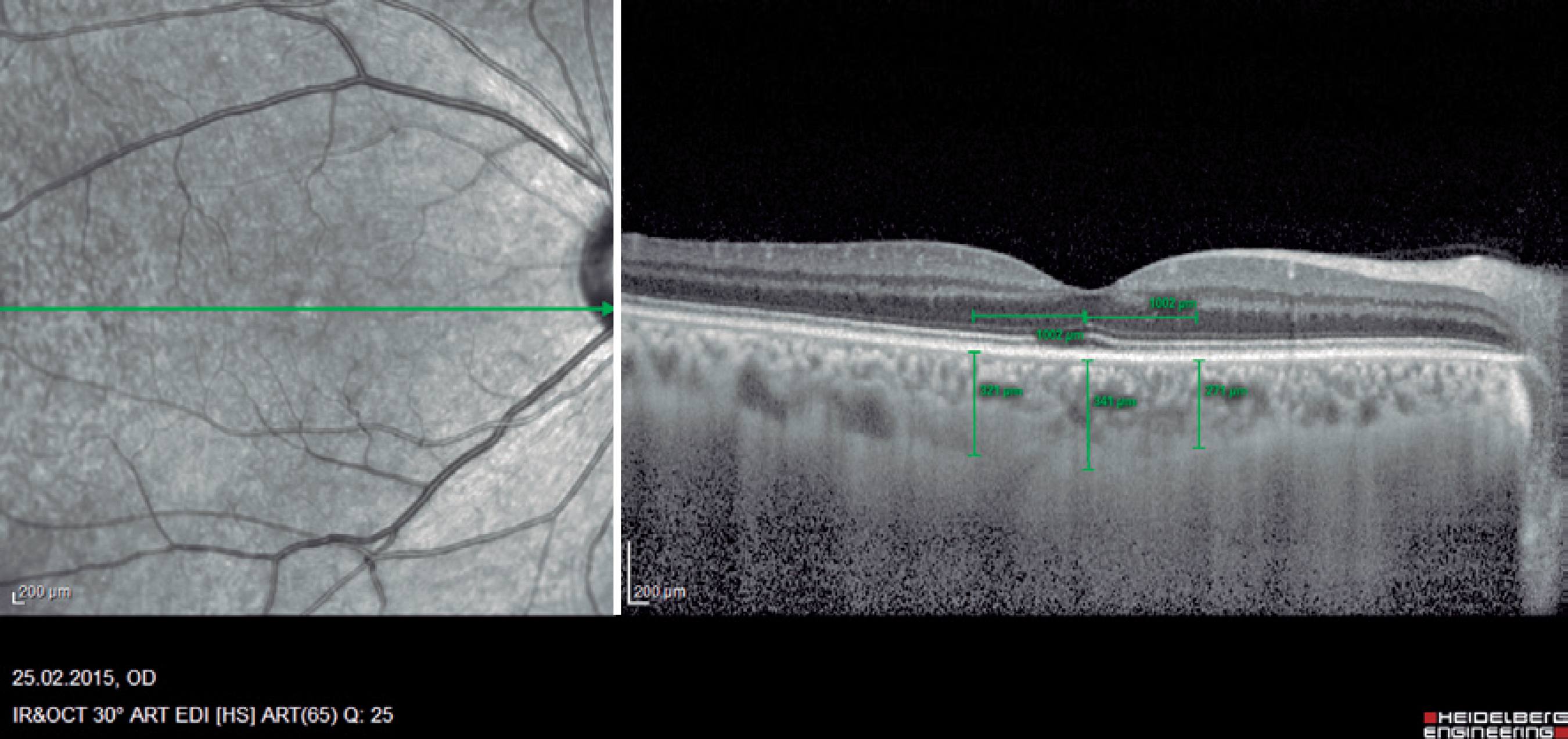 Figure 1 Example of enhanced depth imaging-optic coherence tomography measurements. Central subfoveal choroidal thickness (CSCT), temporal choroidal thickness (TCT; 1 mm temporal CT from the fovea), and nasal choroidal thickness (NCT; 1 mm nasal CT from the fovea).