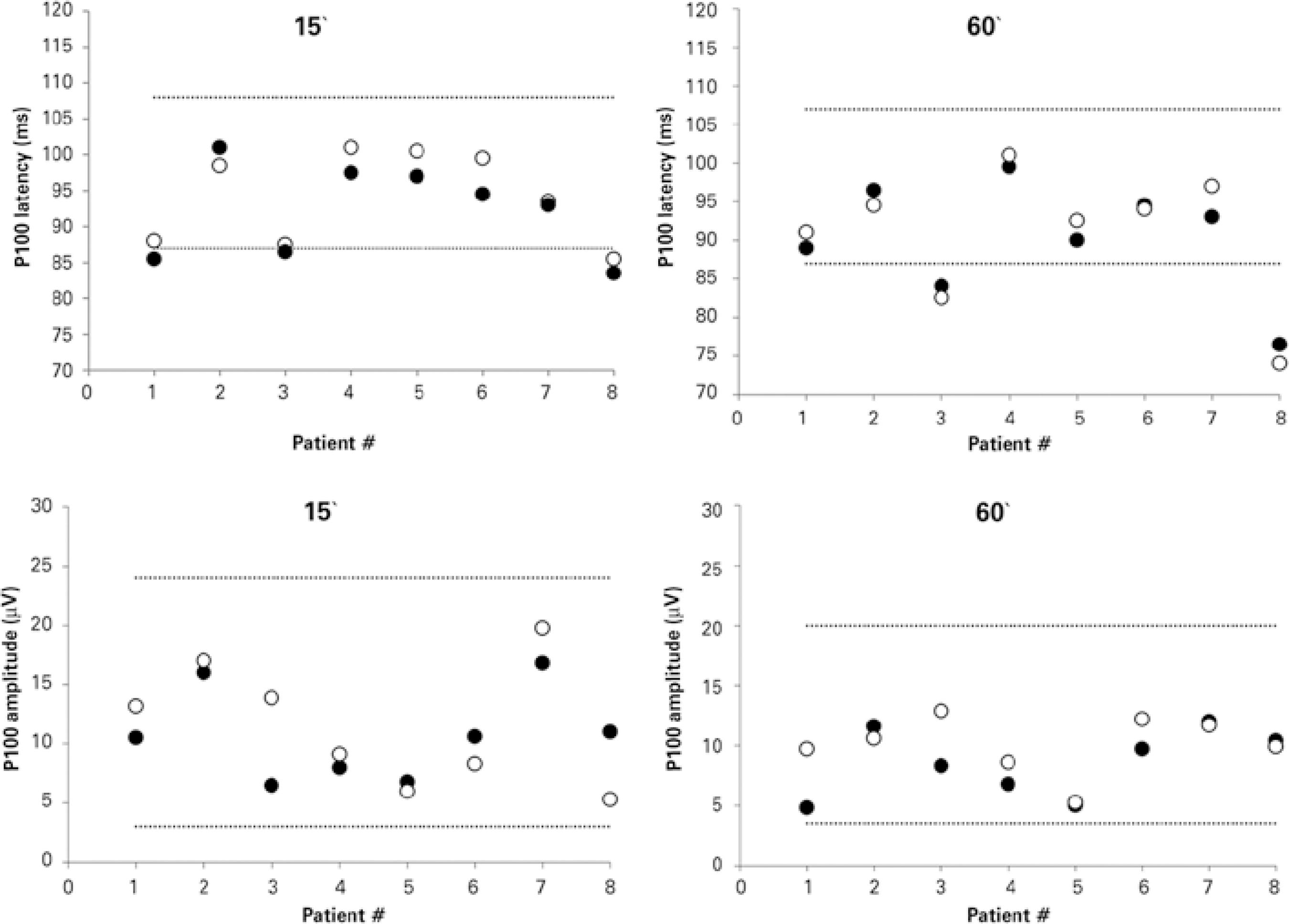 Figure 1 Transient pattern-reversal visual evoked potential parameters for check sizes of 15' and 60', demonstrating P100 latency (upper panels) and P100 amplitude (lower panels). Data were obtained from 8 patients with functional visual loss who were characterized as malingerers. Closed symbols represent right eye data; open symbols represent left eye data. Dotted lines indicate the lower and upper limits of normal as was determined in our own laboratory.