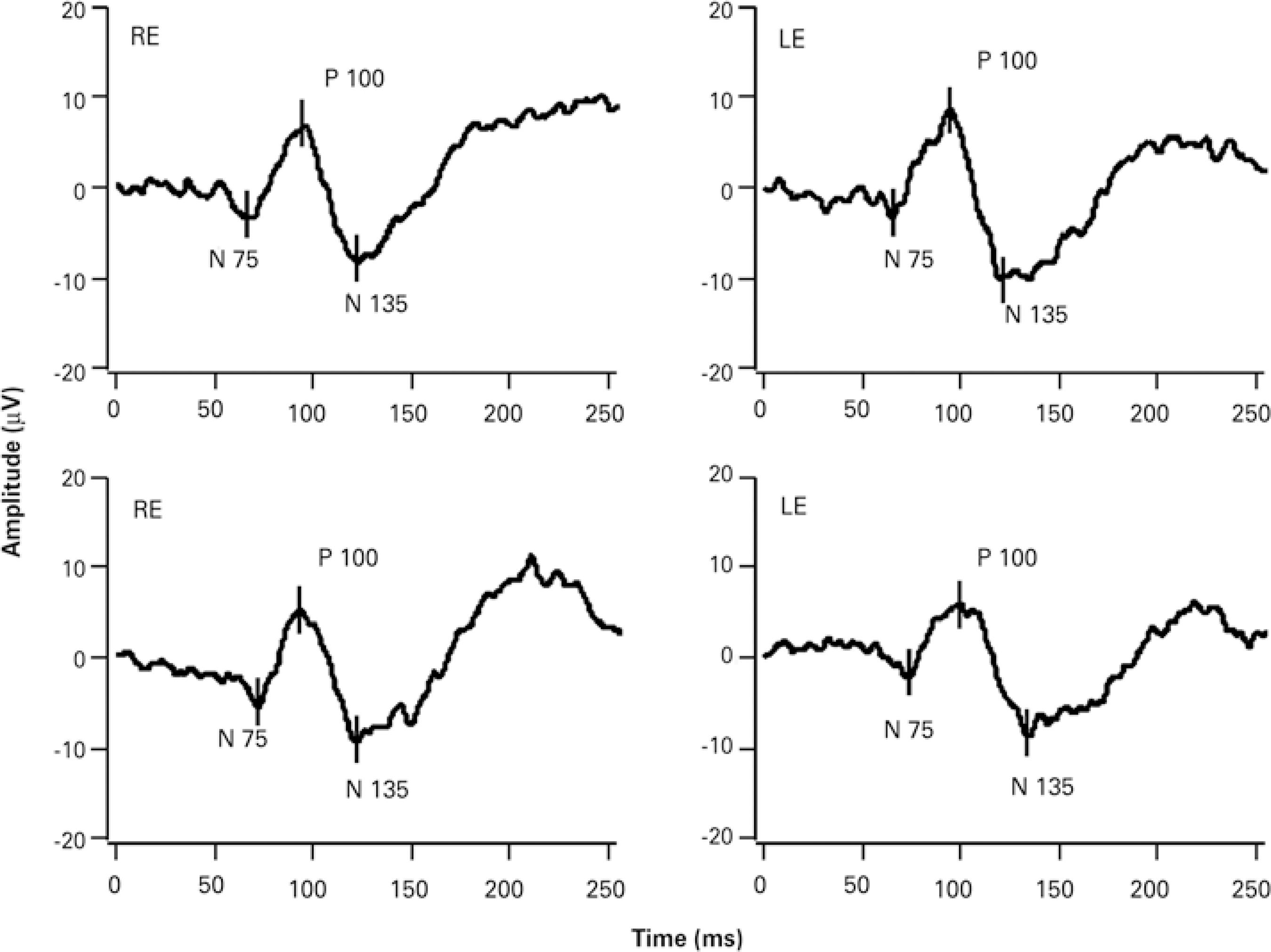 To improve accuracy and compliance, a direct observation of the examined eye was performed, during which the subject was continuously asked to pay attention to the center of the stimulus monitor. In addition, evaluations were performed by experienced examiners and the developing average waveform was carefully observed.