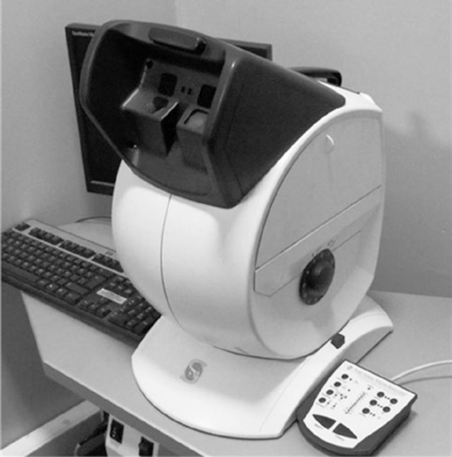 There are several clinical tests for measuring CS with letters or gratings(5,22-26). A limitation of CS tests is low reliability associated with varying environmental conditions and the subjective nature of the tests. In particular, CS tests that use charts may be affected by inadequate or uneven lighting, fading, the subject's learning curve, and reflections(2,3). The Functional Acuity Contrast Test (FACT) assesses five spatial frequencies (1.5, 3, 6, 12, and 18 cycles per degree (cpd)) and 9 levels of contrast for each frequency. FACT uses a small increment (0.15 log unit) and a forced-choice method with three options(2). Although the FACT test has greater reliability compared with other CS testing methods, administration of the CS test in a closed system, with charts on the screen inside the device, with a Functional Visual Acuity (FVA) device has additional advantages. These advantages include the ability to display contrast charts in a random order and the administration of the test with standardized lighting, which is difficult to maintain under other conditions(3,27). A CS test is expected to have a good reliability to differentiate a small loss or detect real progression, which can be better achieved by a closed test system, which has inherently stable testing conditions.