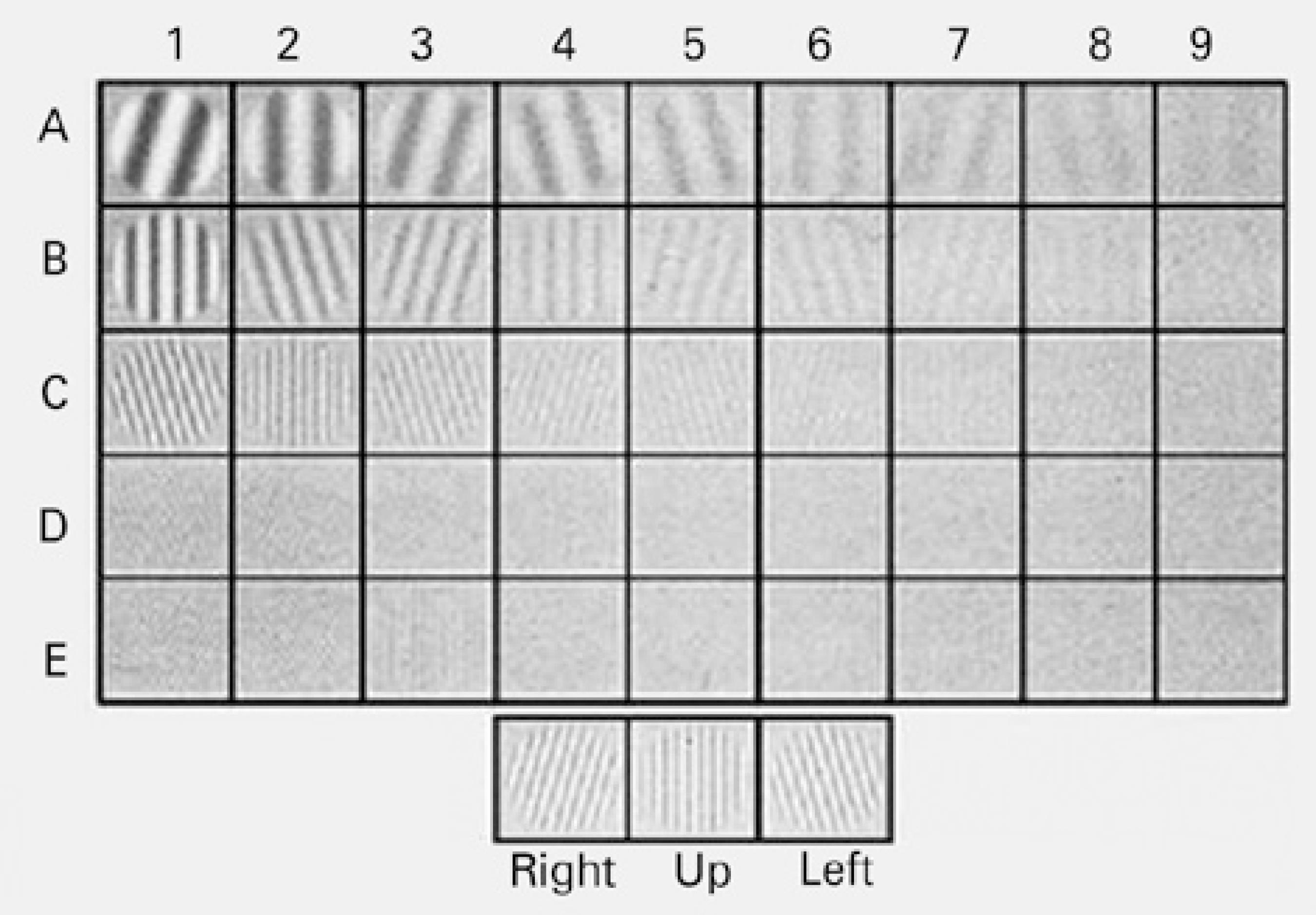 The CS testing device controls light levels with sensors to achieve consistent conditions for each test. This device supplies a target luminance level of 85 cd/m2 for daytime conditions in compliance with the American National Standards Institute (ANSI). It evaluates spatial frequencies using sine-wave grating charts of 1.5, 3, 6, 12, and 18 cpd. Figure 2 presents the sine-wave gratings charts for the frequencies that the CS testing device used. Contrast was defined according to the Michelson formula (C = [Lmaximum − Lminimum]/[Lmaximum + Lminimum], C: Contrast, L: Luminance)(2). CS was measured during two sessions separated by at least one week and up to one month (intersession). At each session, two measurements taken 30 minutes apart (intrasession). All tests were performed with the optimum refractive correction and a natural pupil. All the subjects performed the CS test for the first time during our study, and each test lasted approximately 10 minutes. The CS measurements were obtained by a single operator who was blinded to the patient's group.