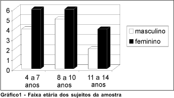 Note-se que a faixa etária prevalente nesta amostra foi o intervalo entre 4 e 10 anos de idade (de 4 a 7 anos: 10 sujeitos e, de 8 a 10 anos: 11 sujeitos). Considerando-se o 3 subgrupos observou-se uma relativa predominância de sujeitos do sexo feminino, o que provavelmente segue uma tendência de distribuição na população em geral.
