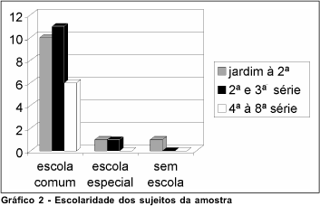 Relativamente à escolaridade note-se que a maioria da amostra freqüentava escola comum à época da entrevista, predominando o período entre o jardim de infância e a 3a série do 1º Grau.