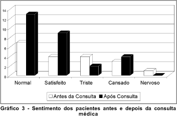 Tecendo alguns comentários relativos aos dados em geral pode-se dizer que, quanto ao fato observado de que os sentimentos anteriores à consulta médica eram mais positivos que os posteriores a ela, esta constatação pode ser indicativa de satisfação do sujeito com o contato em si, com os resultados da consulta ou, simplesmente, efeito da eliminação de fatores ansiógenos imediatos. Pode-se afirmar que os sentimentos positivos prevaleceram sobre os de conotação negativa, indicando que de alguma forma o relacionamento com o profissional pode amenizar certas vivências.