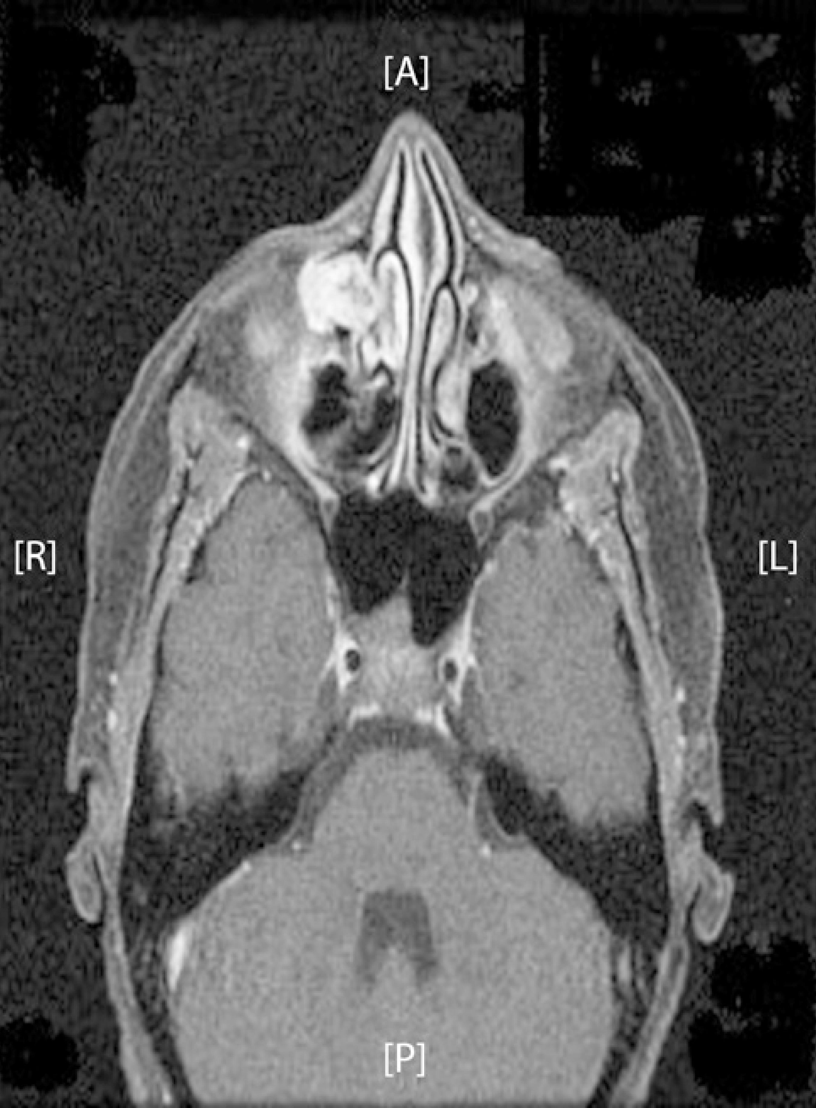 Figure 1 Solid-cystic lesion occupying the right lacrimal sac region consistent with a neoplastic process.